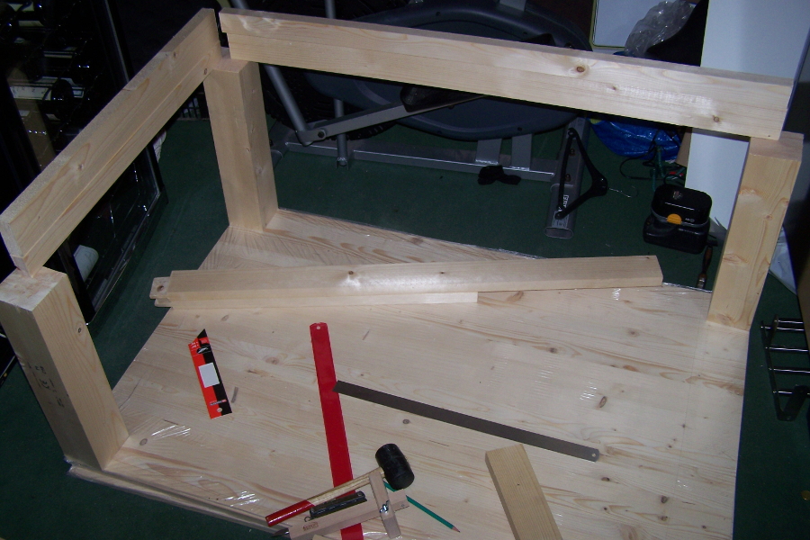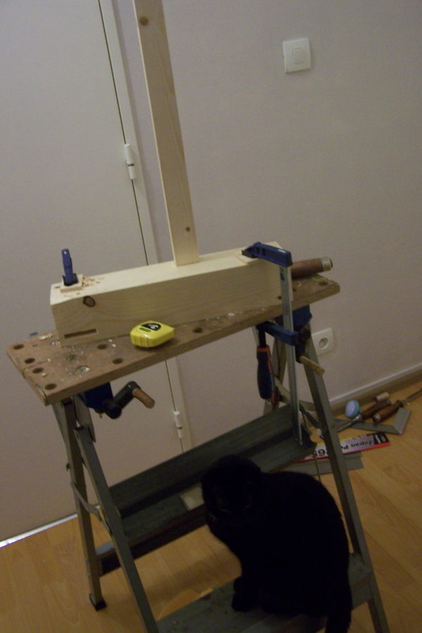 Vu que l'opération est assez répétitive, je ne vais pas vous assommer de photos ... Sachez juste que mes assemblages sont de mieux en mieux ajustés. Dernier problème à régler : j'ai du mal à faire les mortaises parfaitement d'équerre. Du coup, les deux traverses qui se fixent sur un même pied ne sont pas tout à fait parallèles. Vu la flexibilité du pin, j'arrive à les remettre en place, et les deux plateaux devraient rigidifier le tout et forcer l'équerrage, mais c'est perfectible.
