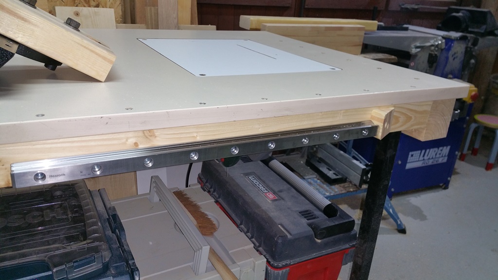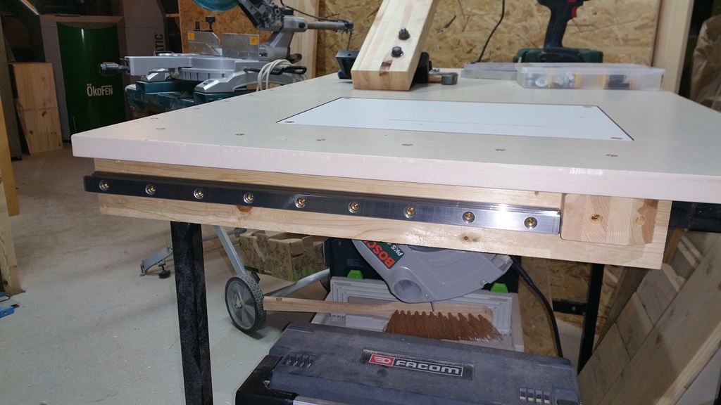Des photos ... Une vue générale de la table actuellement. J'ai donc installé mes 2 rails qui me serviront pour le guide // J'ai donc fabriqué mon guide //, enfin, c'est la base qui me servira de support pour les différents gabarits qui viendront ... J'ai eu l'occasion de récupérer des profilés alu type Norcan, ils sont gros et peuvent difficilement servir de rails sur la table ... Je vais donc m'en servir de rail de guidage pour la chariot, j'ai donc fait un prémontage ... On voit les guides dans les rails que j'ai taillé dans des morceaux de téflons que j'avais récupéré il y a un certain temps...