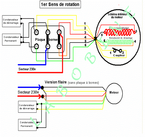 C'est un moteur 6 fil de bobinage, deux condensateur comme sur le plan ci dessous : Le moteur tournait bien à vide, mais après 1 à 2 secondes de contrainte l'un des condensateur à explosé comme un pétard avec 11 jours de retards...