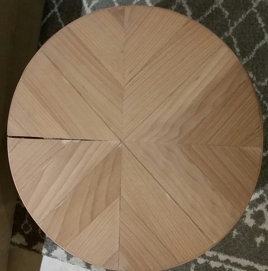 Pour le piètement c'est une croix (diametre 2 fois inférieur à celui du plateau) chevillée et collée au plateau et j'ai rajouté 4 vis pour bien plaquer le piètement sur le plateau.