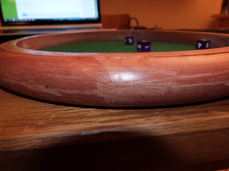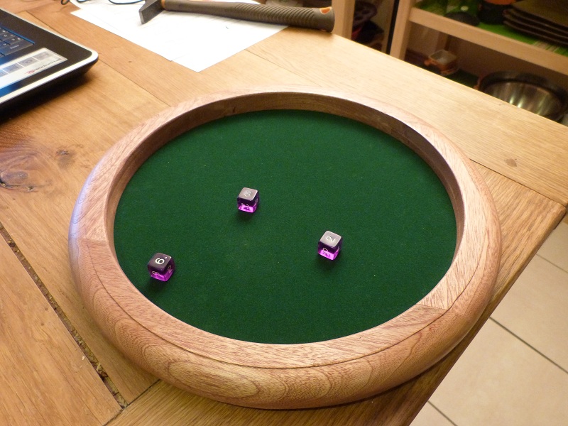 voici une piste de dés en sapelli, le fond est en mélaminé (chariot de chutes acheté 15€) et feutrine adhésive (10e le m2 chez LM).