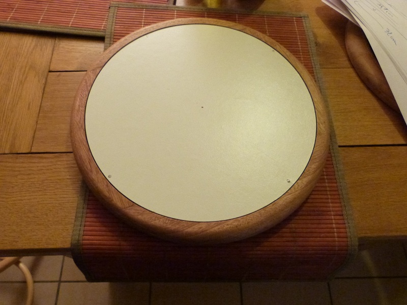 voici le fond. c'est du mélaminé de 8mm sur lequel j'ai collé la feutrine adhésive. il est pointé sur une feuillure de 10mm de large. ainsi si le diamètre intérieur vu de dessus est de 27cm, le fond lui a un diamètre de 29cm. j'en ai fait une autre avec un fond en contreplaqué, plus joli. mais bon en général on ne regarde pas trop dessous!