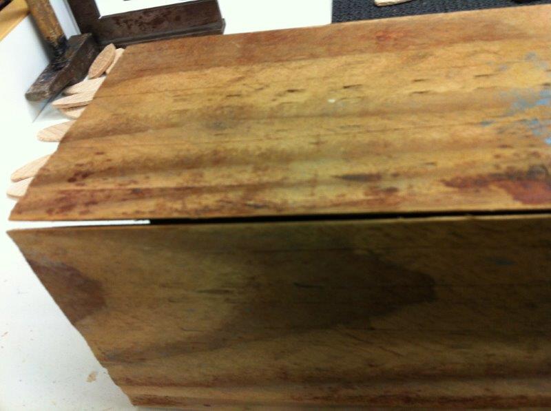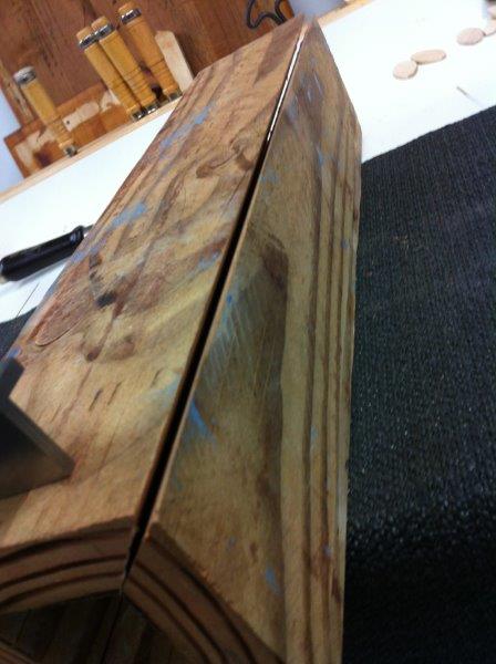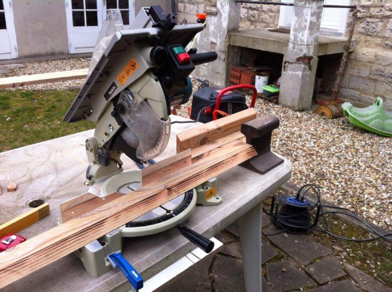première étape, un petit coup de ponçage histoire de dégrossir et supprimer toutes les échardes ensuite je déligner la planche à coupe d'onglet : voilà le résultat : l'œil averti remarque de suite que la coupe n'est pas droite mais suit le fil du bois... l'assemblage s'annonce difficile....