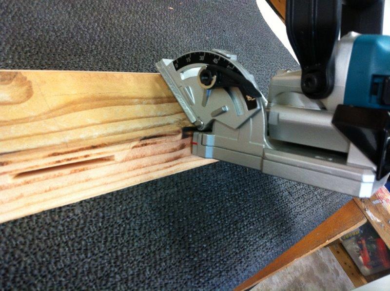 l'idée est d'assembler les faces avec des lamelles, dont acte : je fraise trois lamelles par onglet. Les pieds fond 460mm de long, ça devrait suffire.