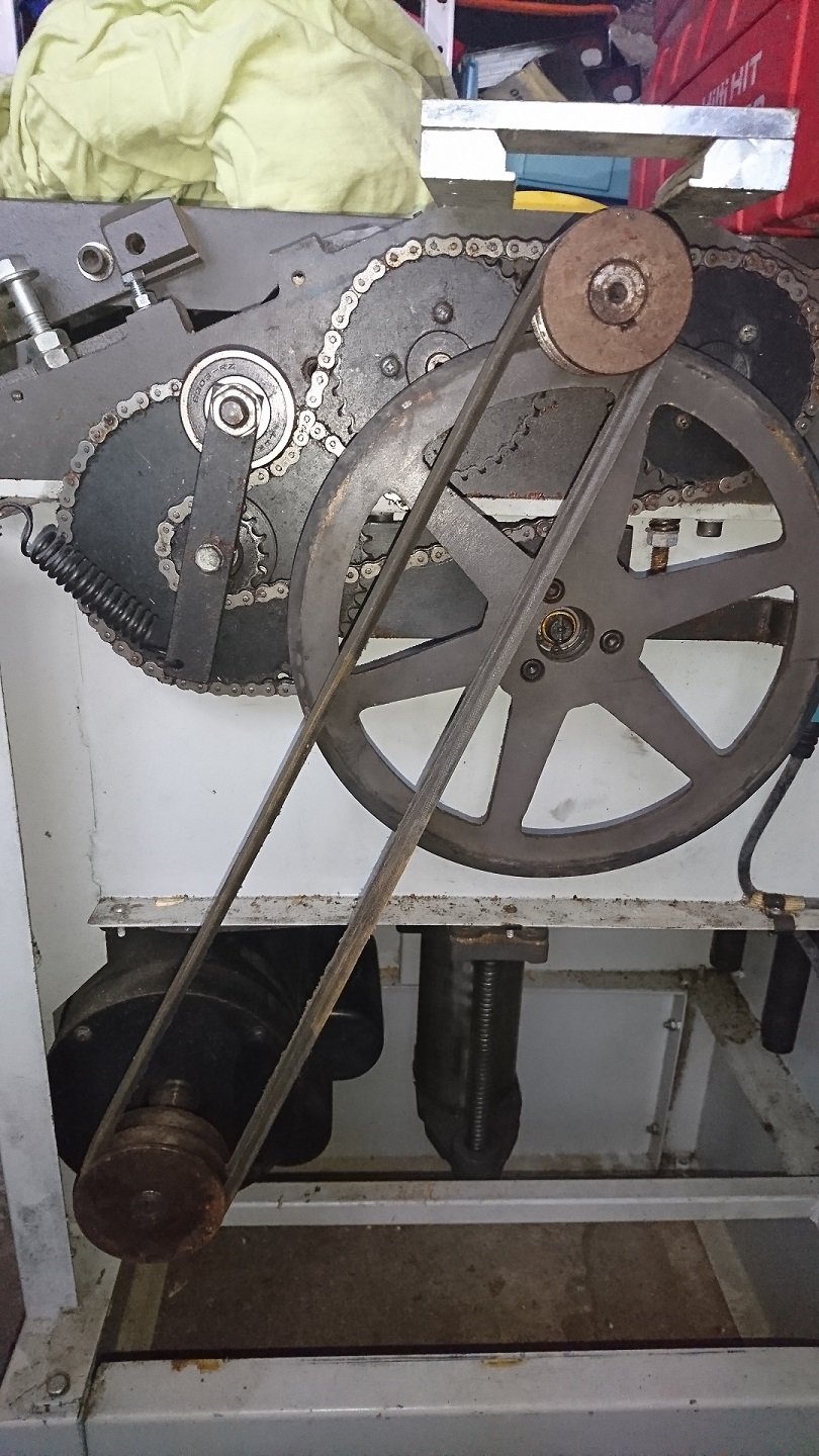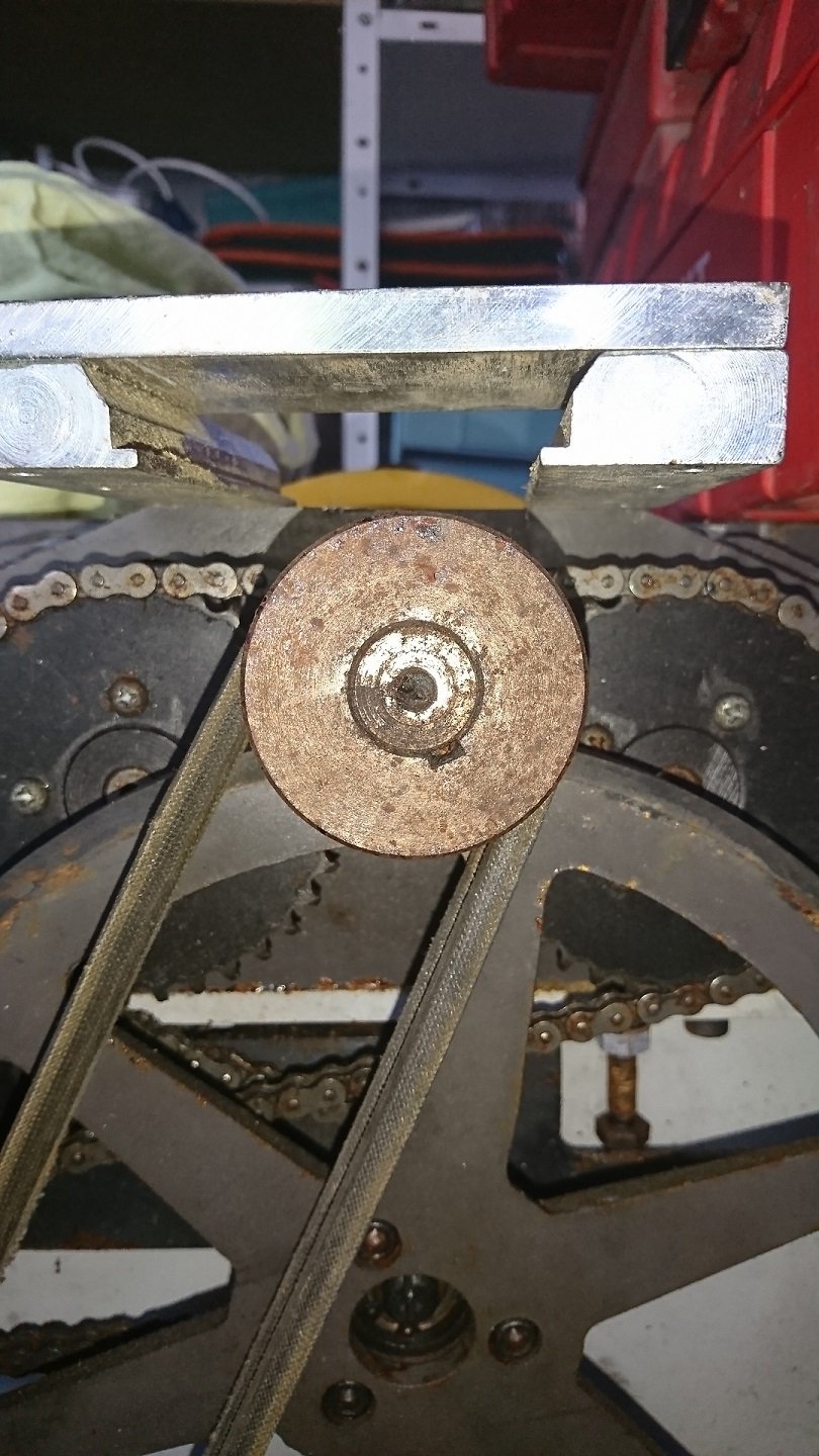 Je ne pourrais pas prendre d'autres photos que celle figurant sur ce post avant la fin de semaine, cependant, si cela peut t'aider, la construction est à peu près la suivante: Un cadre en forme de H réalisé à partir de cornières acier 30x30 ( n'importe quelle section peut faire l'affaire, mais j'en avais en stock....) dont la longueur est légèrement inférieure à celle de la machine et la largeur à celle des emplacement de fixation du moteur; aux 4 extrémités de ce H, j'ai fixé ( que j'avais en stock également) des équerres de même section qui sur l'une des faces ont un trou oblong afin qu'elles puissent coulisser de quelques mm sur la structure en H ( important pour pouvoir mettre la structure en place dans le bati). Sur le bati j'ai reporté les emplacement des charnière et réalisé une série de trous oblongs également afin de pouvoir ajuster la tension de la courroie ( il s'avère que le poids du moteur, déjà important assure à lui seul une tension qui semble appropriée). Pour la fixation du moteur sur la structure, rien de compliqué, 4 trous positionnés de sorte que les poulies soient bien coplanaires ( il y aura toujours moyen d'ajuster de quelques mm sur la poulie du moteur afin de peaufiner le réglage) et enfin serrer le tout.