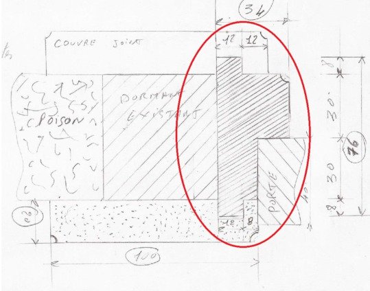 merci pour ton avis ca me rassure ,j'avais un peu peur la ou j'ai fais le rond vert qu'en cas ou l'on ferais claquer la porte,que ca casse a cet endroit j'ai modifié un peu mon plan en effet j'ai remarqué plusieurs anomalies la premiere se situant , par rapport a mon dessin au niveau bas de la partie entouré en rouge sur ma premiere idée présentée je n'ais pas fait attention quand ouvrant la porte j'allais voir le chant du couvre joint dans la feuillure du faut dormant , et la deuxième erreur au niveau coté paumelles même défaut et en plus j'allais fixer celle ci a cheval entre le couvre joint et le faux dormantlamouette a écrit : ↑18 déc. 2018, 18:11 salut