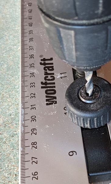 Les trous sont d'abord prépercés à la perceuse (mèche de 5) avec le gabarit de perçage Wolfcraft pour avoir quelque chose de plus ou moins régulier. La précision importe assez peu ici car le plan de travail n'a pas vocation a être utilisé comme table de sciage.