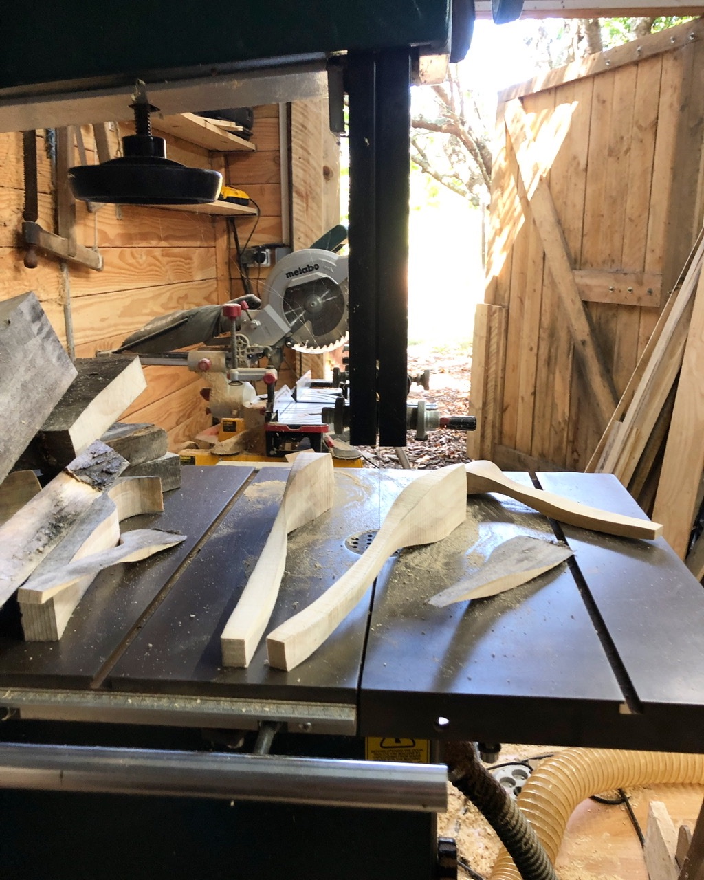 Le matin même j’ai donc préparé à l’atelier deux ébauches, bon je l’avoue j’ai triché, elles n’ont pas étés faites à la hache. Je ne les ai pas encore affûtées et ne disposais pas de suffisamment de temps pour cela. J’ai scié le morceau de peuplier choisi à la sar à la forme approximative des ustensiles voulus:
