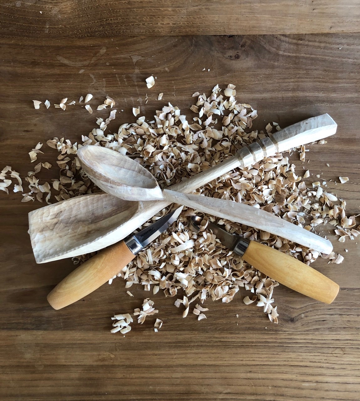 Il y a quelques années que je m’intéresse à la sculpture de cuillères « à la suédoise », c’est à dire avec 3 outils seulement, une hache, un couteau croche et un couteau de type Mora.