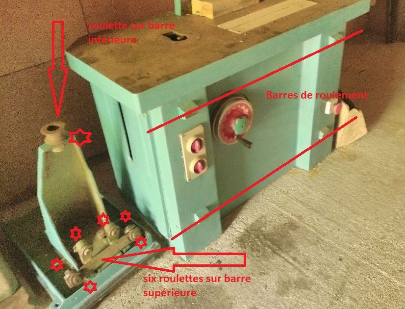 Sur la 1 photo c'est bien un chariot, on remarque sur la machine à côté les fixations pour installer deux barres rondes qui permettent le coulissement. J'ai l'impression que c'est du 380 vval67 a écrit : ↑30 juil. 2022, 18:21 Dommage que ce soit loin de chez moi, je serais bien passé voir un peu deux-trois machines. La scie, oui, ça m'a bien l'air d'une scie toupie, on voit l'ouverture pour laisser sortir l'arbre et perso une bonne scie de qualité qui ne prend pas non plus la place d'une scie à format, ça me fait saliver. En plus on dirait un chariot juste à gauche de la machine, et des trous pour fixer un système de coulisses à l'avant de la machine. Regarde dans l'atelier si tu ne trouves pas l'ensemble qui permet de monter le chariot sur la scie-toupie, ça donnerait tout de suite une machine qui permet plein de possibilité genre tronçonnage, usinage de tenons etc... et qui pourra donner envie à davantage de monde.