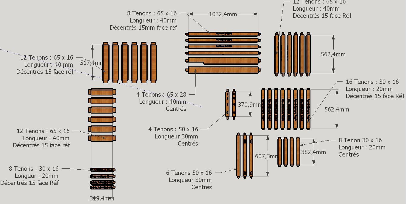 Je prend note que c'est potentiellement une source d'erreur, mais comme toutes mes mortaises sont similaires, je pense pouvoir pointer la mortaiseuse avec le bédane de 16 ou de 13,6 et faires toutes les mortaises au bon endroit. Pour les tenon, j'attaquerais le gros avec les disques à tenonner, là aussi pointés une fois pour toutes les traverses. Pour la finition des tenons ils seraient faits à la scie et au rabot de paume pour les épaulements puis ajustés un à uns.