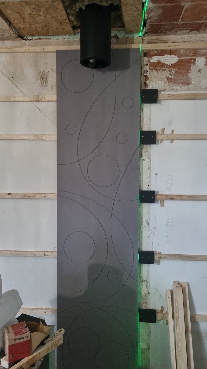 c'est très bien. Comme ça la partie critique, contre le conduit, est protégée.Du coup après réflexion, j'ai fait un motif sur panneau valchromat et j'habillerai en châtaigner sur les côtés !