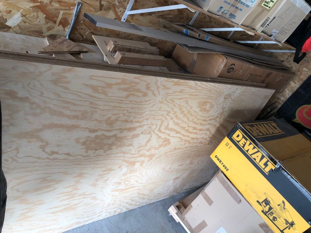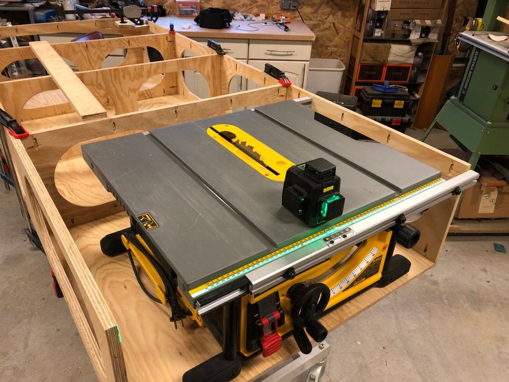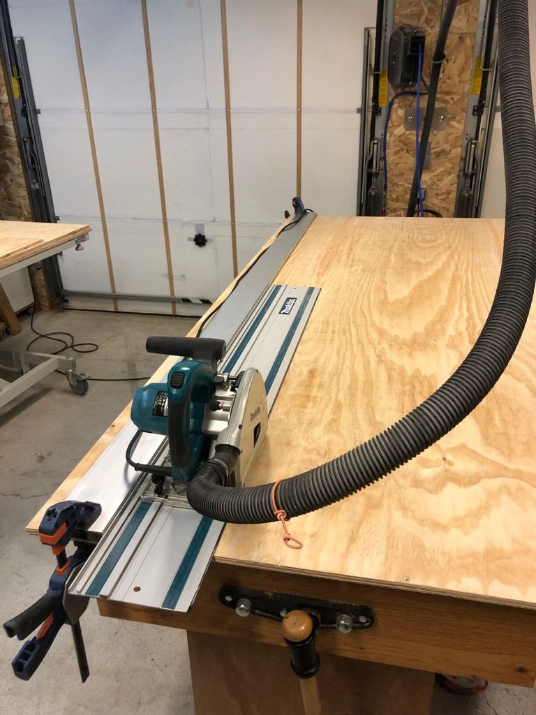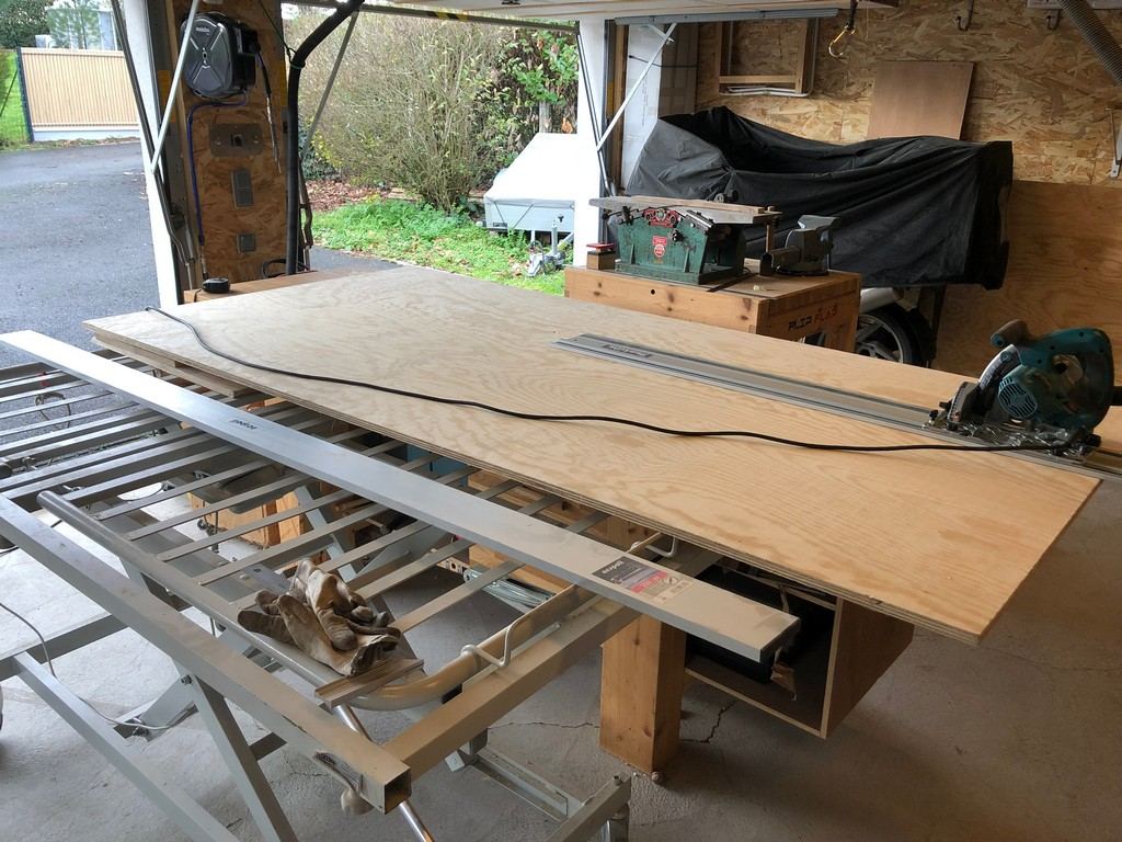 Je vois que tu as une scie sur rail ( idem ici). J'ai donc mis un martyr tenu par des pions en bois sur l'un des lits qui me sert de plan de sciage. Tu poses ton panneau dessus et tu scies en pénétrant de 1 ou 2 mm (et des jours tu te trompes et pénètre franchement plus). Lorsque il est très abimé on peut soit le retourner soit le changer. C'est un sacré gain de temps , facilite la manutention ( tu poses le panneau 1 fois) , le sciage et " la chute "ne tombe pas.