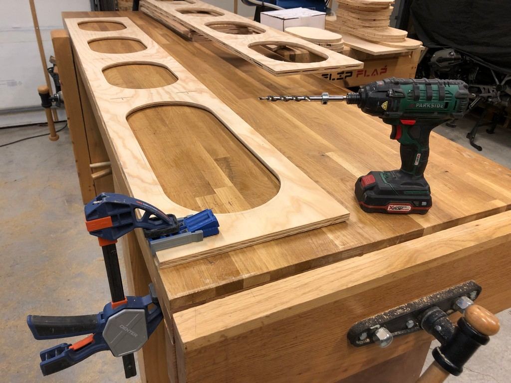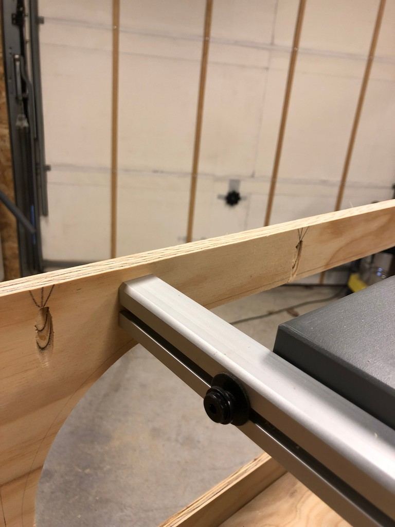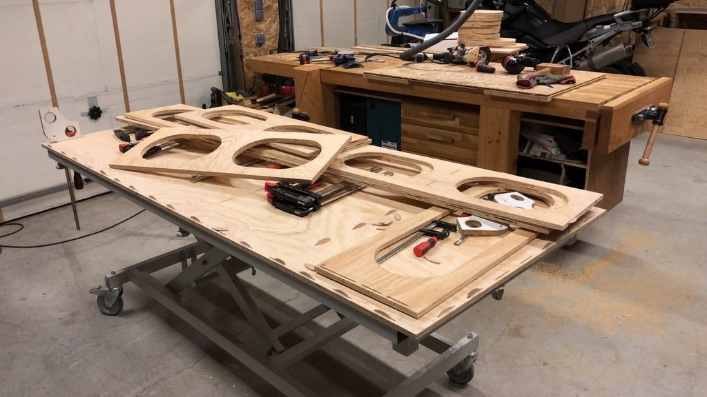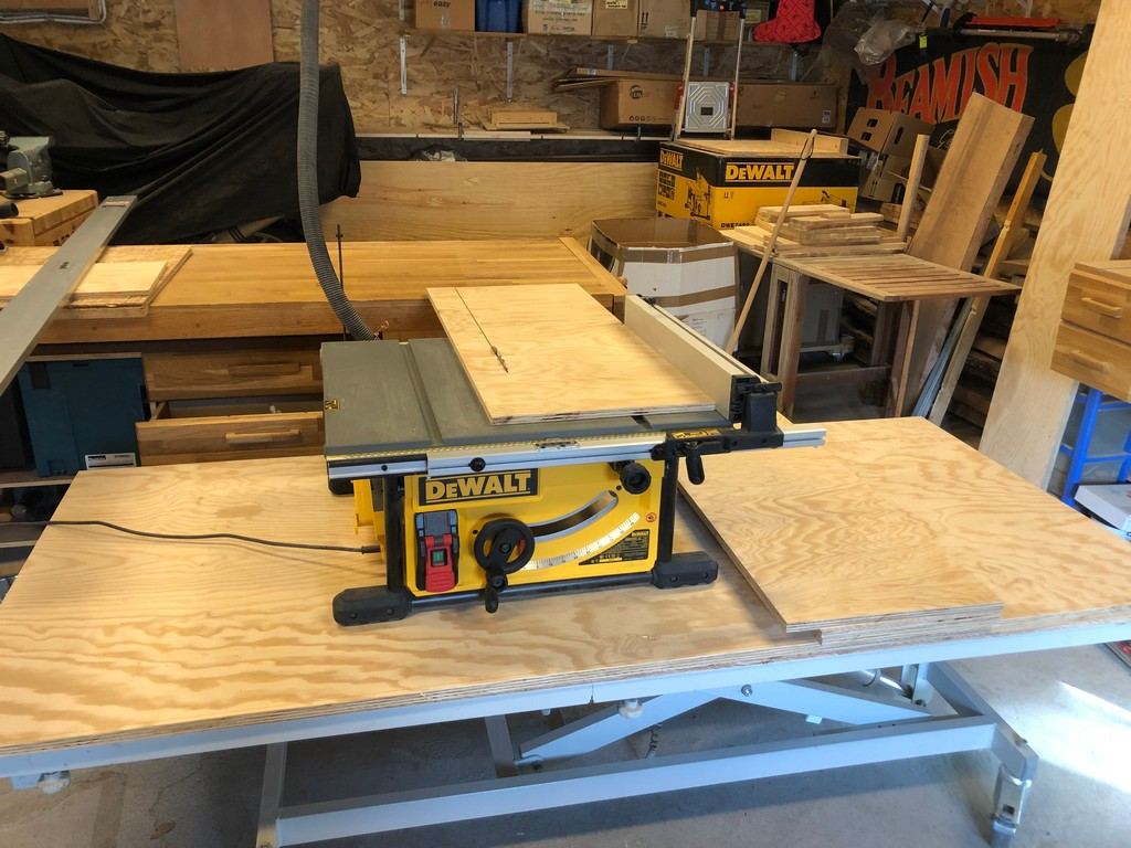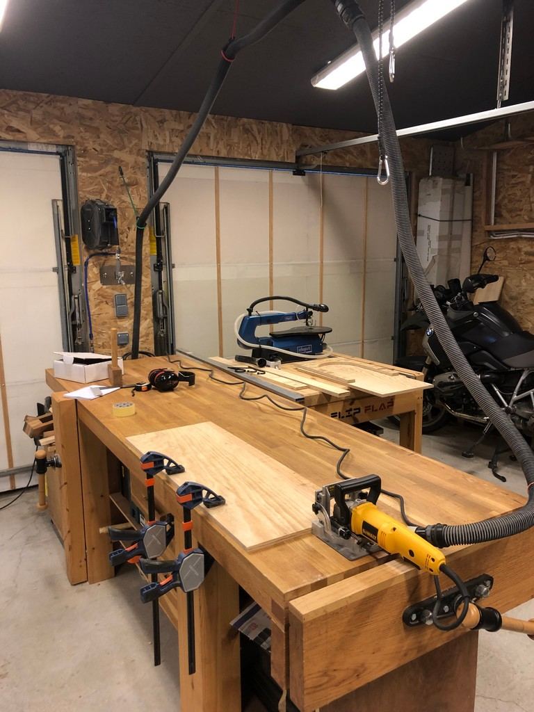 Tu pourras aussi le mettre à la même hauteur que ton établi si un jour tu a besoin d'un grand plan de travail tout en gardant la possibilité d'un passage entre les 2 (commode aussi).