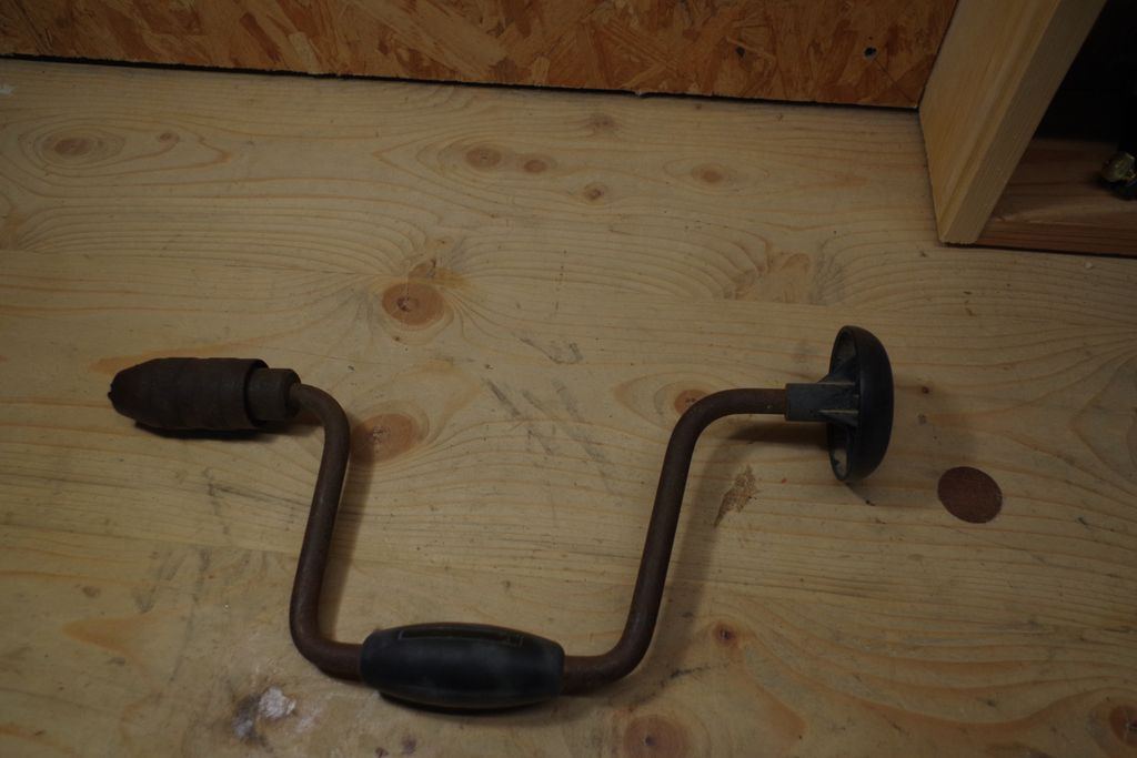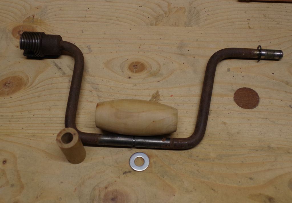 Les parties rouillées ont été traitées au vinaigre puis brossées et vernies, la poignée tubulaire a été coupée en 2 à la scie japonaise, la rondelle qui assure le maintien a aussi été coupée en 2 et ajustée à la lime, le tout a été réassemblé et les 2 moitiés ont été recollées à la néoprène. Finition avec une cire teintée .