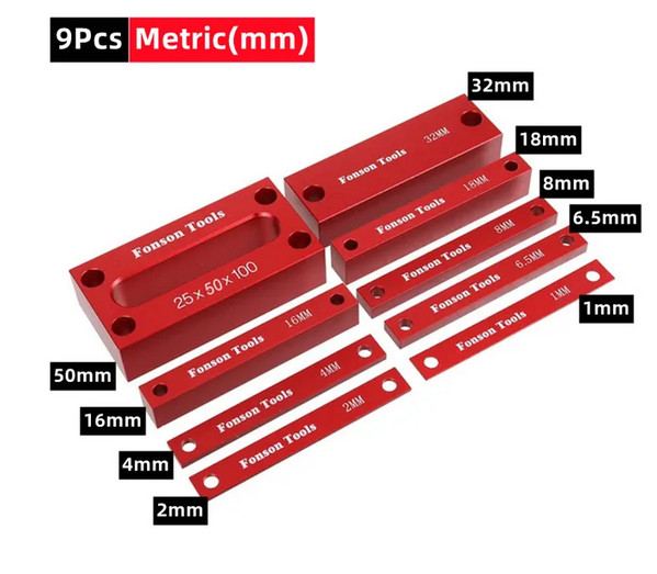 Le jeu métrique de neuf pièces comprend trois cales en vinyle (deux de 0,5 mm d'épaisseur et une de 1 mm), des blocs d'aluminium de 2 mm, 4 mm, 8 mm et 16 mm d'épaisseur (un deuxième bloc de 16 mm est compris pour simplifier l'espacement de 32 mm), ainsi qu'un bloc d'acier de 25 mm x 50 mm x 75 mm. Les cales et les blocs d'aluminium ont une précision de 0,05 mm et mesurent 50 mm de longueur. La précision du bloc d'acier est de 0,018 mm. Les éléments du jeu combinés peuvent combler un espace de 0,5 mm à 123 mm par intervalles de 0,5 mm.