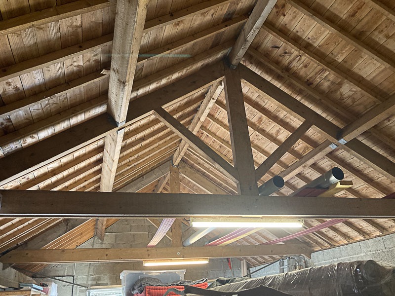 - mezzanine de stockage (que du léger) au-dessus de la porte du garage, entre pignon et 1ère ferme soit environ 3,15x5,40m pour libérer de la place sur les murs