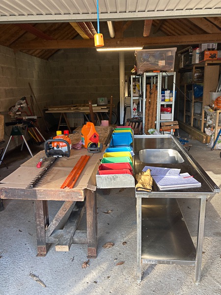 - arrivée d'eau à prolonger vers le poste évier/plan inox + gérer l'évacuation des eaux usées (vers les eaux pluviales pour les eaux sans danger pour l'environnement et bidons pour les eaux à évacuer dans les eaux usées ou en déchetterie)