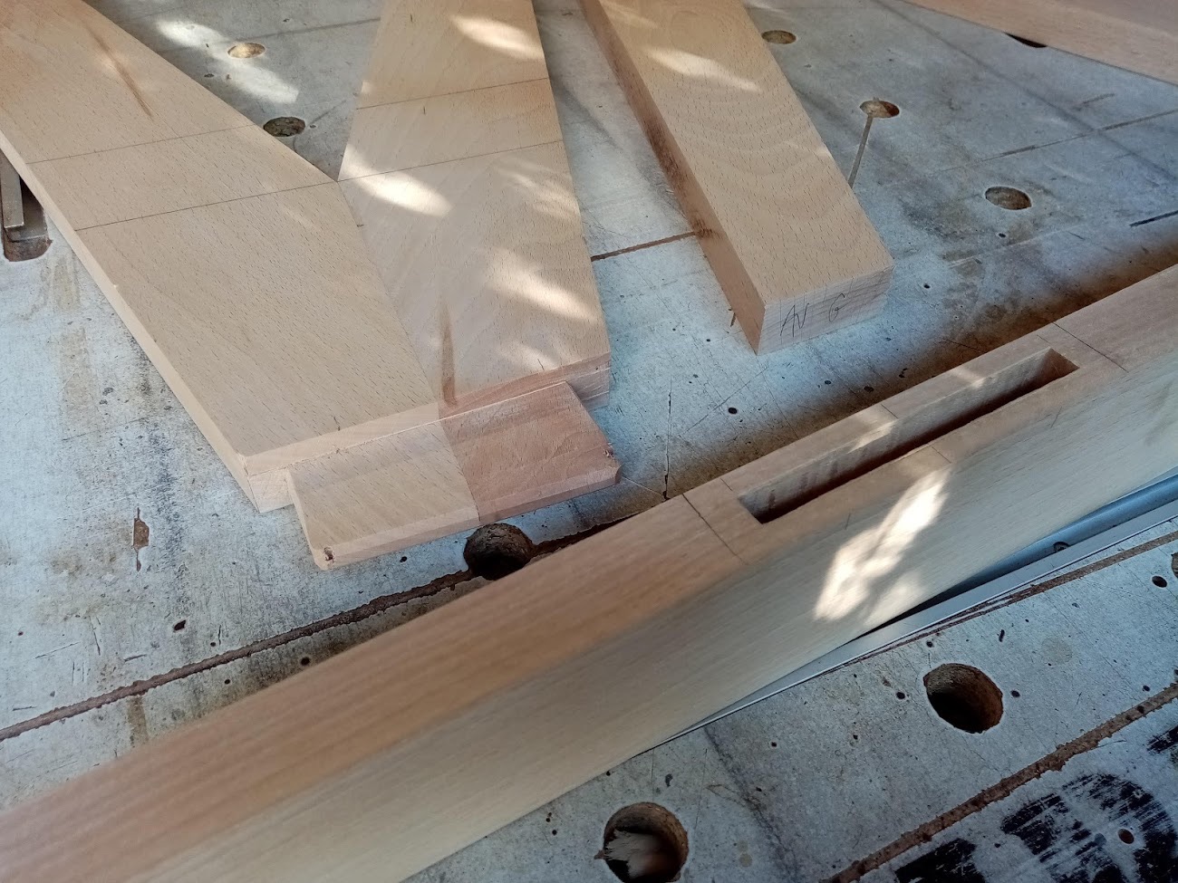 Comme on était dimanche, pas de grand bruit avec scie sous table &co, les tenons sont taillés à la scie dozuki (une merveille d'efficacité) et ajustés au guillaume, mais par contre j'ai fait les mortaises à la mortaiseuse à bédane carré avec un bédane de 10mm.