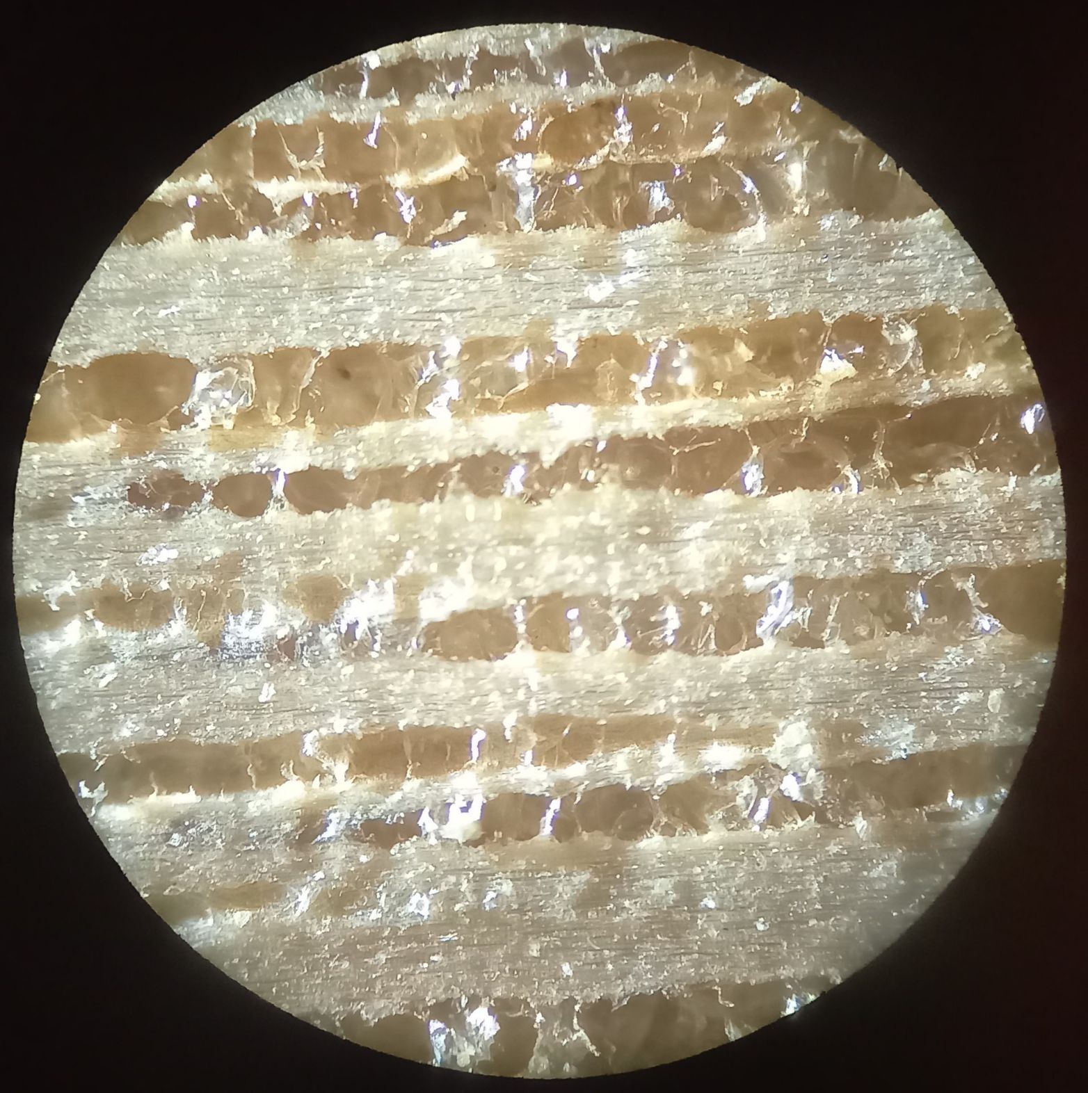On voit bien les capillaires qui étaient une fois remplis de sève. On voit aussi des saletés qui peut-être sont dues au fait que ce morceau traînais mal rangé dans mon atelier.
