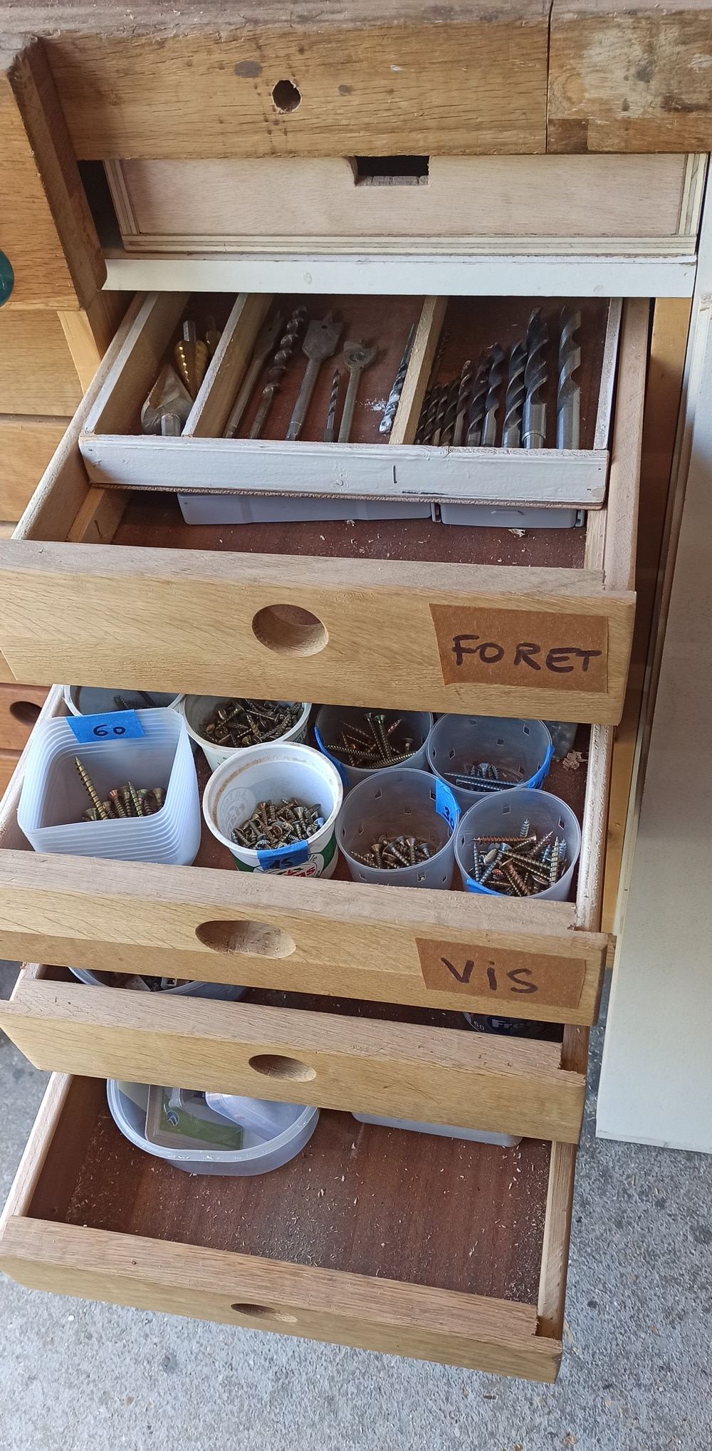Pour les tiroirs, si c'est juste de l'utilitaire tu peux utiliser du contreplaqué, ce sera le plus rapide à faire. Du CP de 10mm va bien, pour le fond ça dépend de la taille de tes tiroirs et de comment tu vas les charger, si peu chargé tu peux descendre un peu. Perso j'ai tendance à surdimensionner mais c'est parce que j'ai utilisé ce que j'avais sous la main (10mm pour le fond comme pour les côtés).