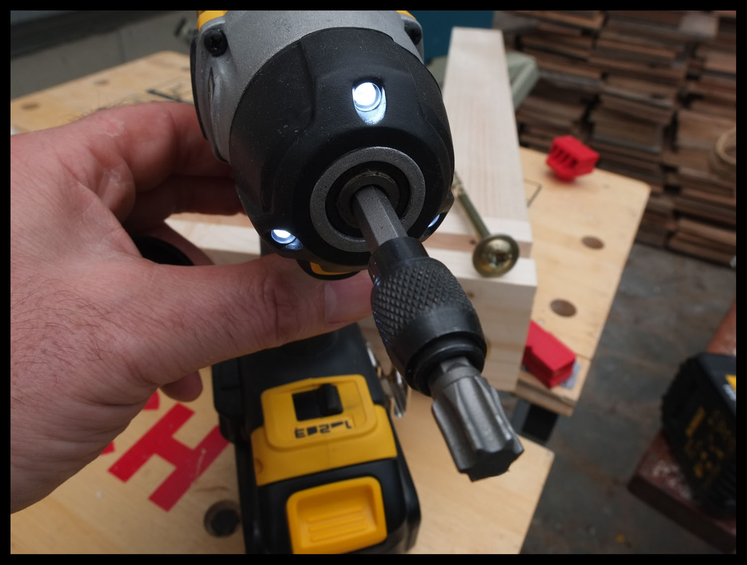 Dernier point, l'utilisation d'une visseuse à choc dans le bois n'empêche pas le pré-perçage. Soit pour empêcher l'éclatement du bois ou pour définir l'alignement avant de visser.