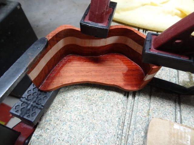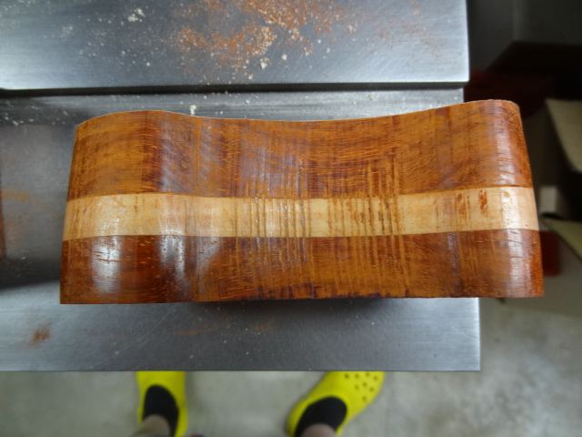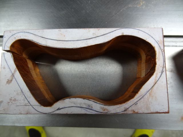 Je croyais la chose facile, et j'ai attaqué fort par un sandwich padouk 21 - hêtre 10 - padouk 21 ce qui donnait 52 mm de bois plutôt très dur à couper.