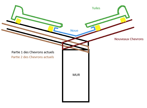 Je joins un petit schéma, au centre du schéma, on retrouve deux dessins, ce sont les deux "types" de charpente actuellement (en haut, le mur est "découpé" pour accueillir le chevron, en bas, le chevron repose sur le mur).