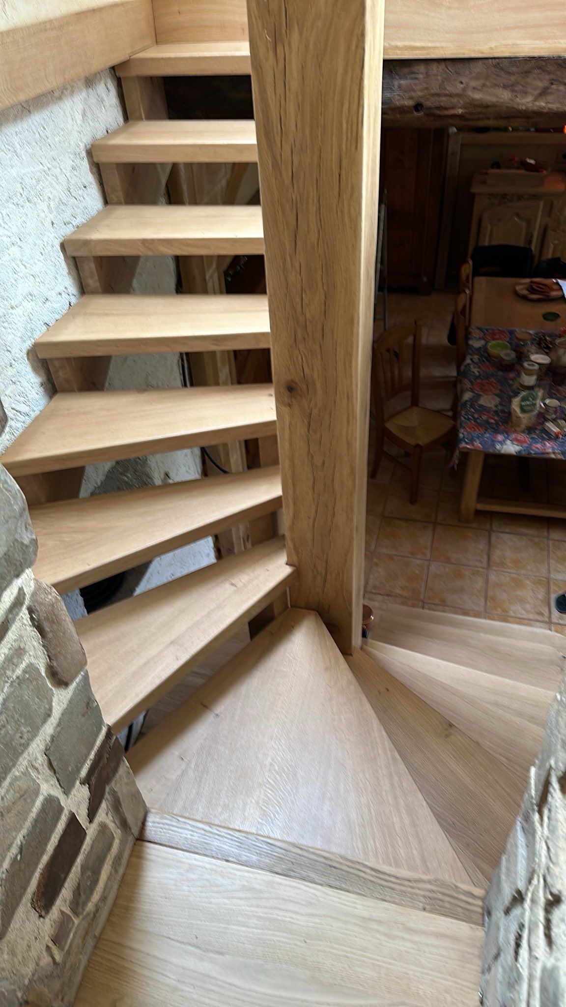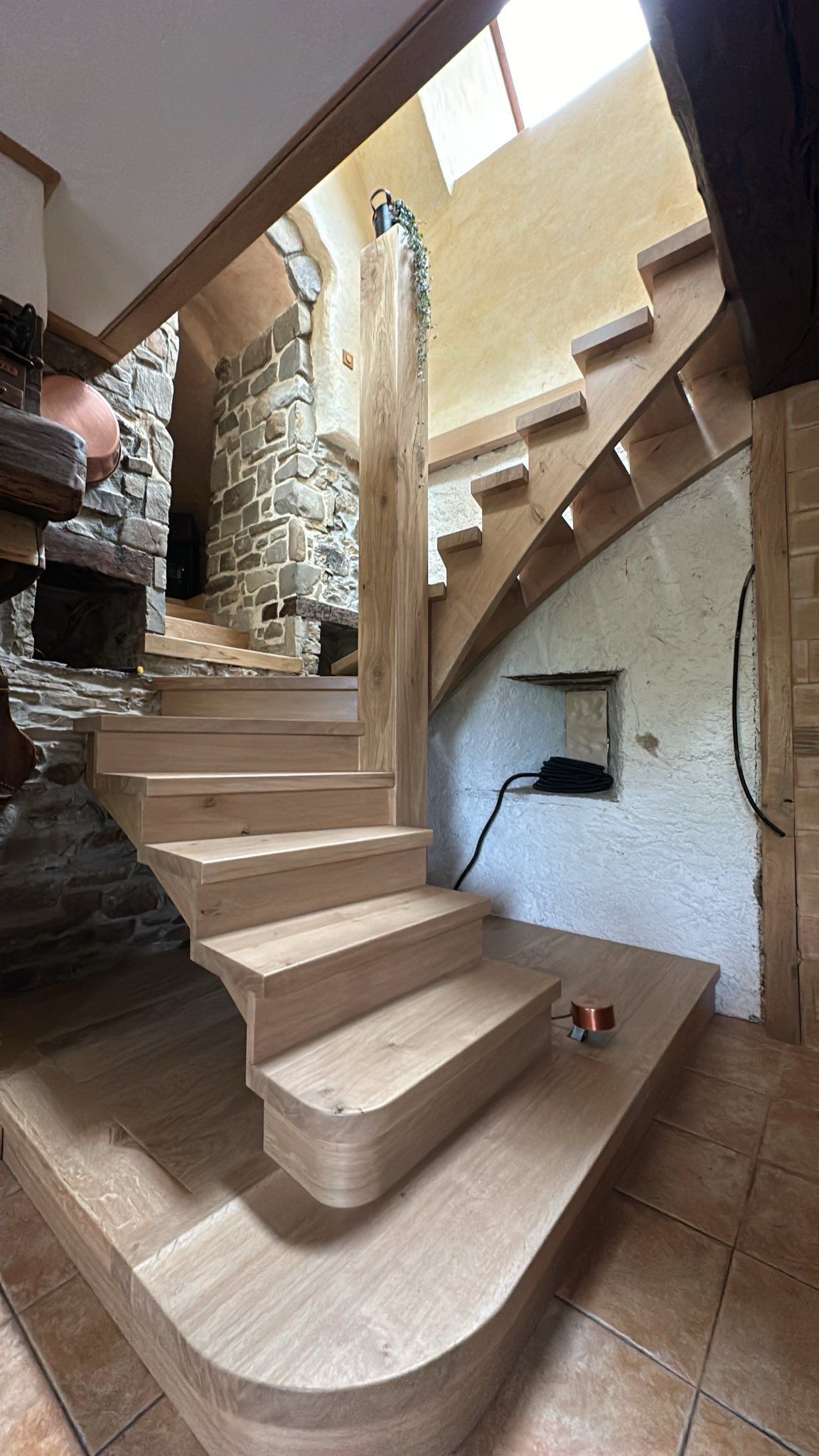 Je partage ici une fabrication de l'année 2024 chez mes beaux-parents. La demande: un escalier en chêne massif, visuellement massif aussi (épaisseur de marches 55mm), avec contre-marches en partie basse mais sans en partie haute car un velux apporte de la lumière (longère).