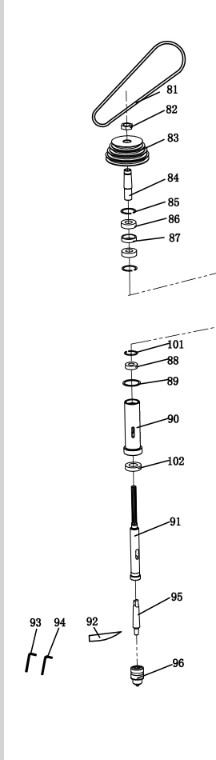 Bien vu pour la 84 : C'est la pièce conique qui reçoit la poulie en haut et la broche en bas. Elle est montée sur 2 roulements bloquées en translation par 2 "circlips"