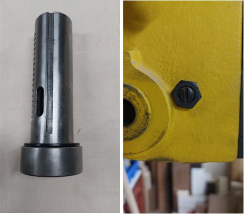 cale en bois avec un trou conique fait au forêt étagé + écrou de poulie + empilement successives de rondelles pour sortir l' axe de poulie du bâti
