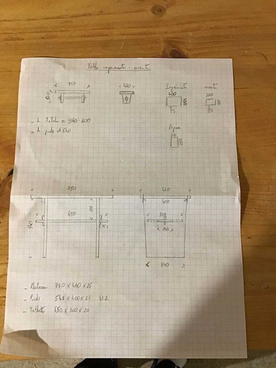 Le plan assez basique, juste 4 pièces : deux pieds très larges, un plateau, une tablette. Je vais essayer des assemblages sans colle : entaille et tenon pour la tablette, entailles avec queue d’aronde pour la liaison pieds-plateau. (Merci pour vos conseils).