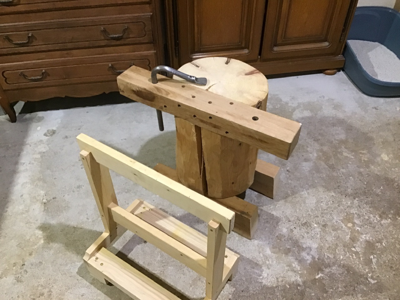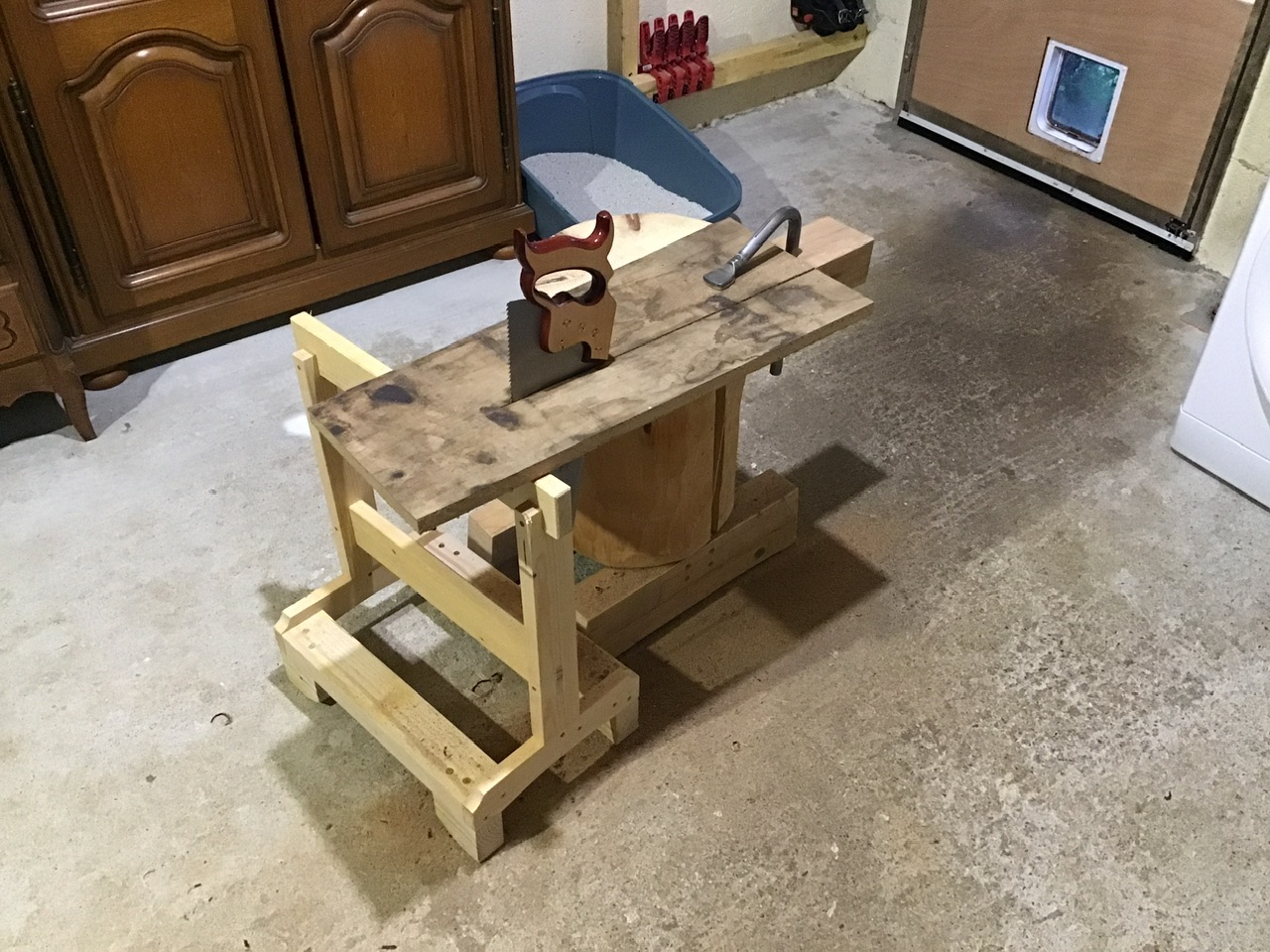 J’avais fait ce « mini établi » pour pouvoir creuser des bols dans le jardin aux beaux jours. Mais en fait il rempli très bien le rôle de banc de sciage, parce qu’il est très lourd donc très stable; je peux maintenir la pièce avec le valet et mettre les deux mains sur la poignée de la scie. Pour le corroyage je m’en sors uniquement avec les greppes oui. Là elles étaient en face pour le riflard mais je les place plus souvent en bout d’établi pour le reste.