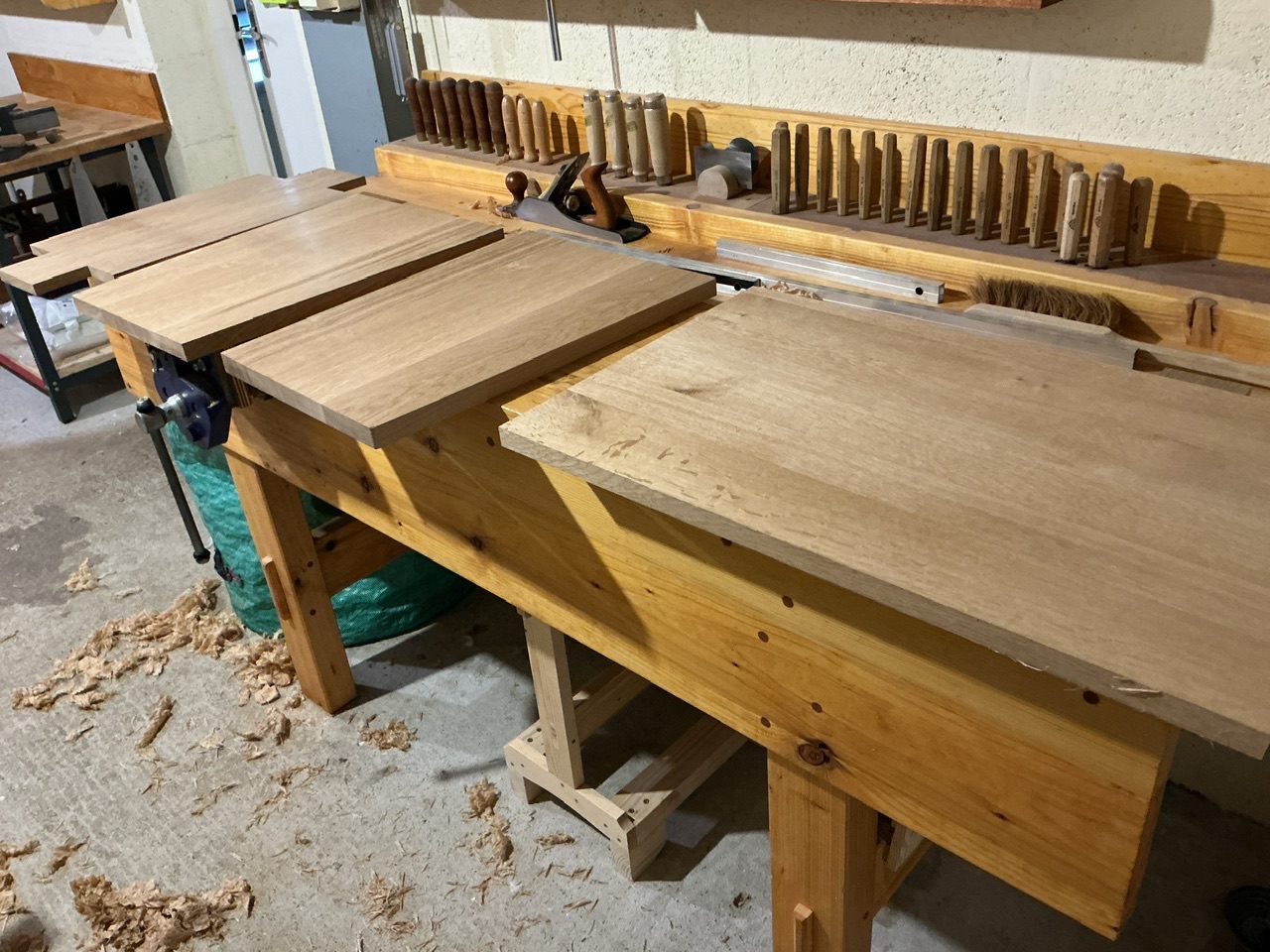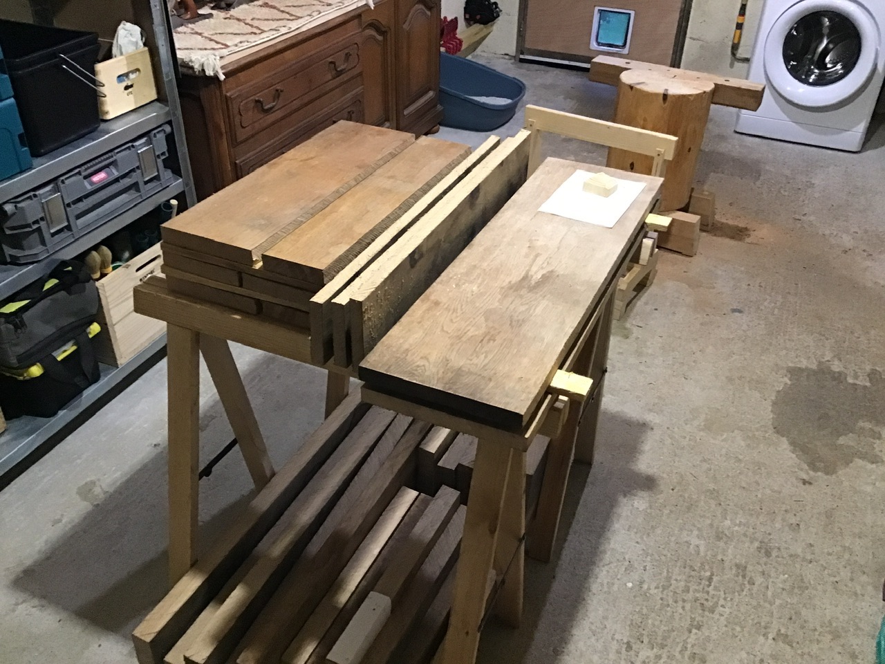 Puis ça sera pour une table basse, j’ai déjà fait le débit (on voit sous les tréteaux de la 4eme photo), des plutôt grosses sections, j’me sens pas de m’y attaquer à la main. Surtout du vieux chêne…