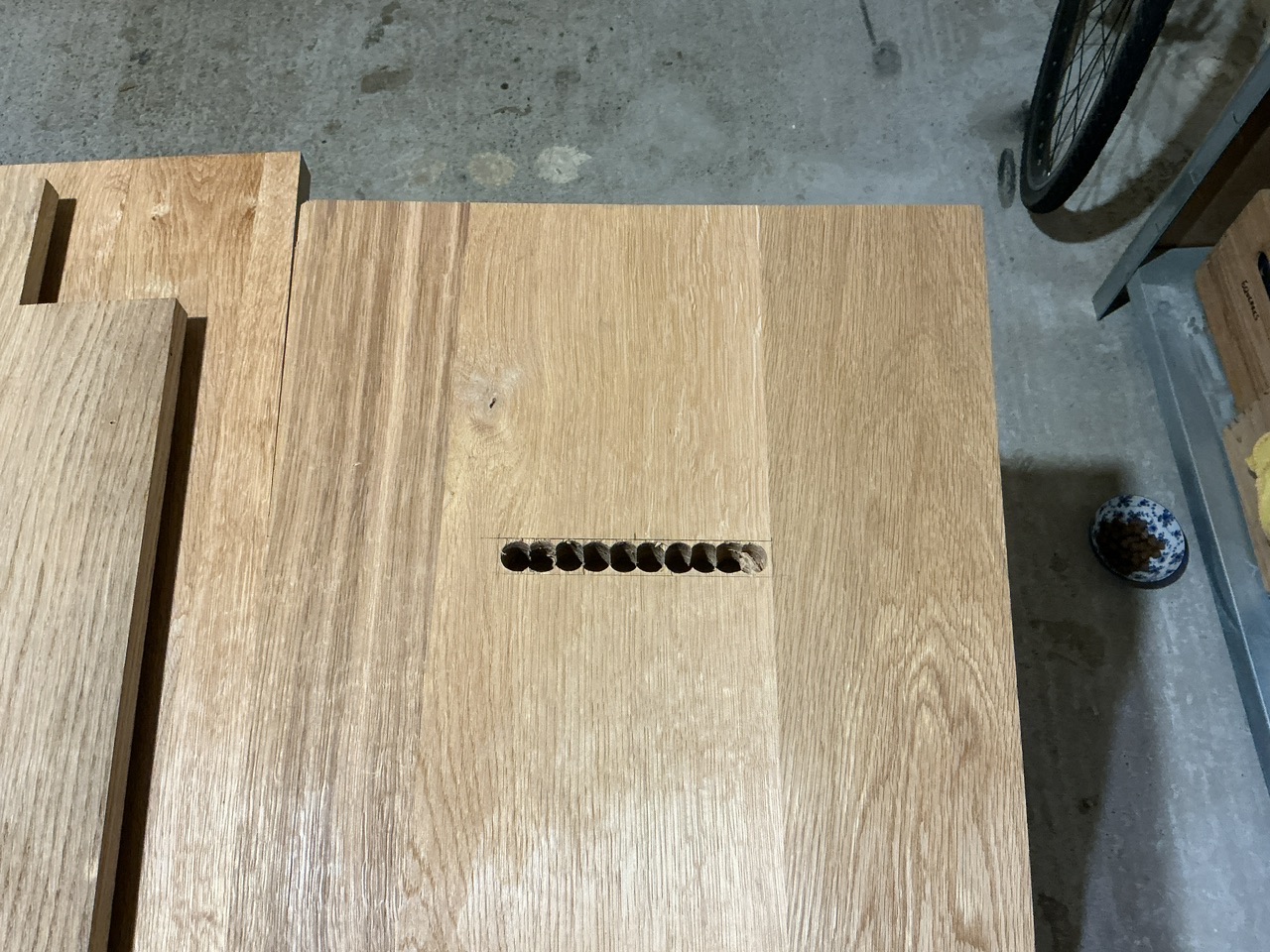 Heureusement que je trace avec les pièces, et pas en série comme quand on travaille à la machine. La tablette fait 17mm d’épaisseur d’un côté et 19mm de l’autre. Aucune incidence, la référence c’est la partie supérieure.