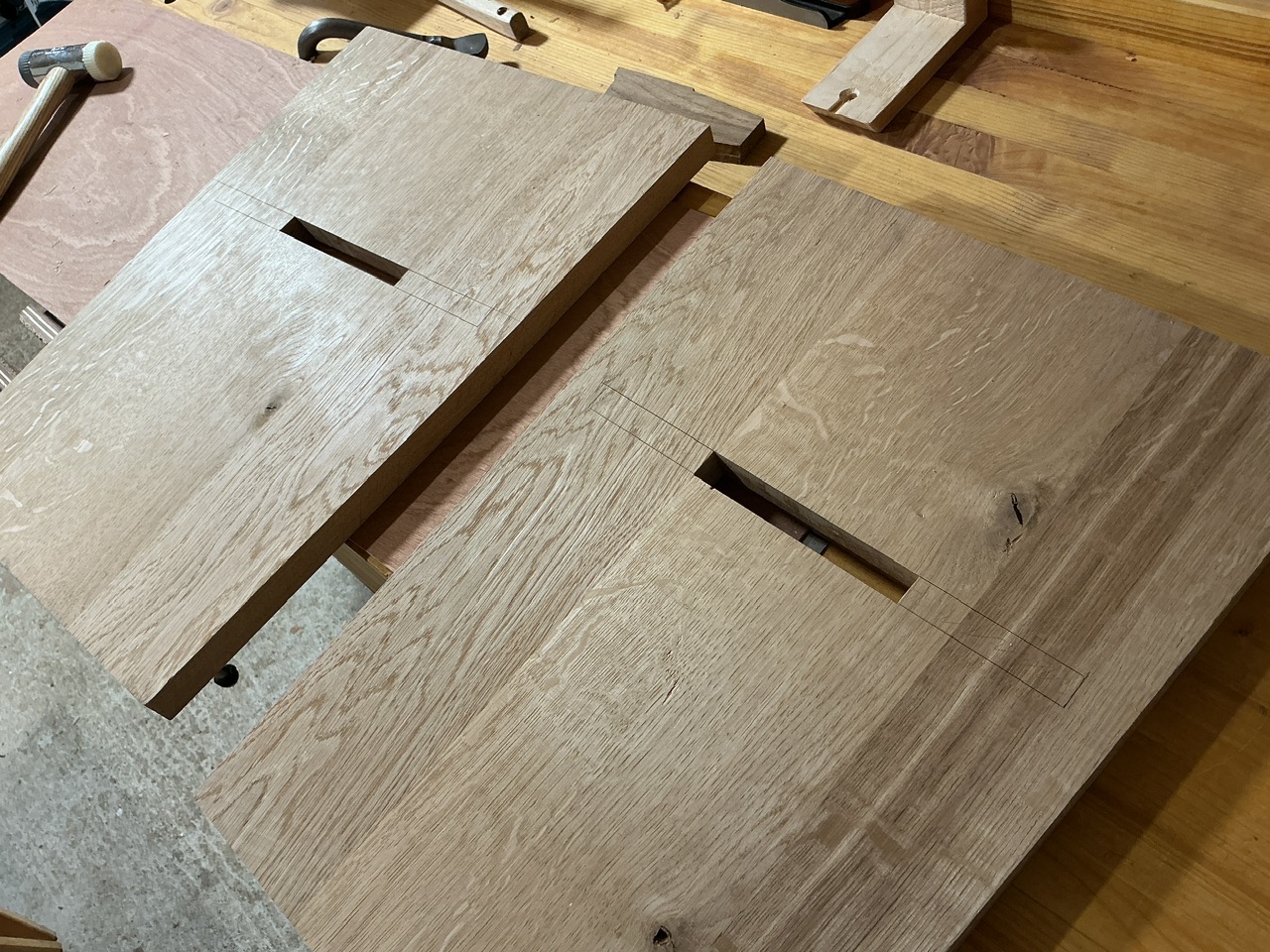 J’ai pu faire les deux mortaises. D’abord avec le vilebrequin, puis au ciseau pour finir.