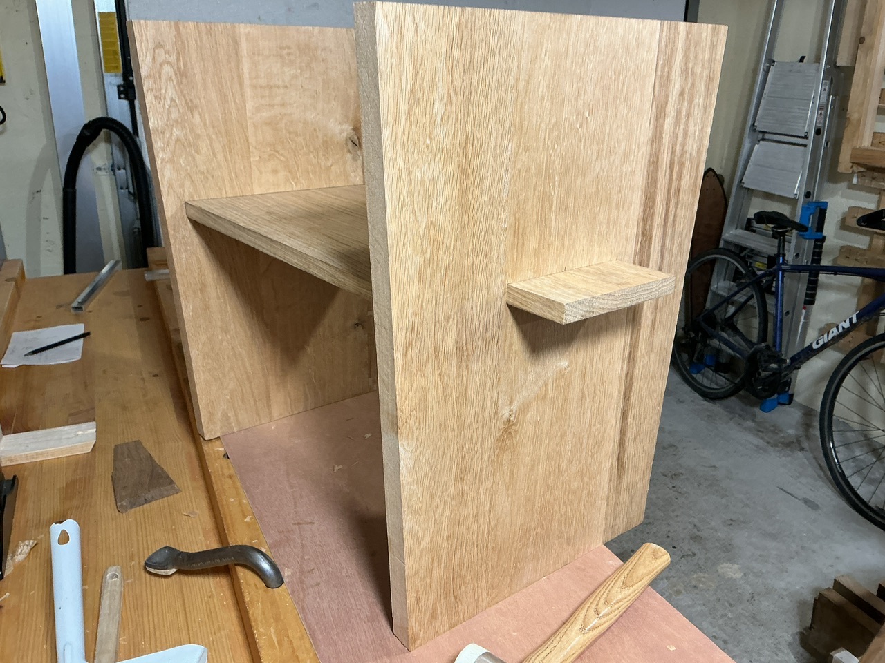 Bon voilà j’ai bien avancé: mes 4 éléments sont corroyés, coupés et rabotés en longueur (d’où le tenon pour la tablette).