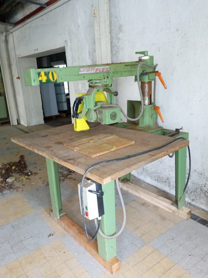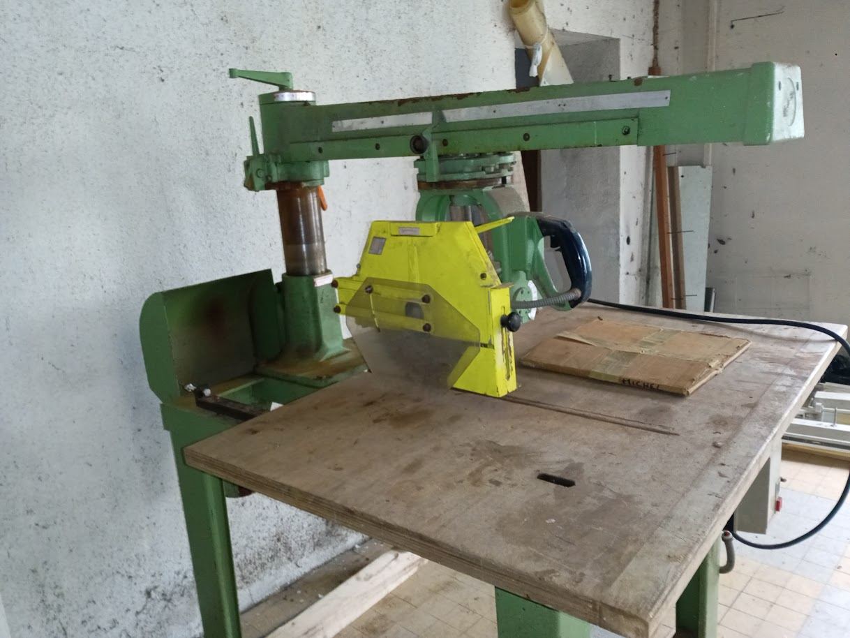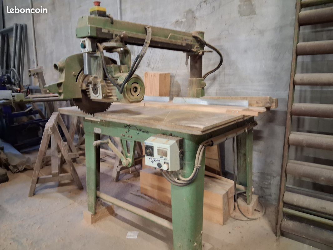 J'ai acquis, avec un lot de machine (rabo/degau, toupie, scie à ruban...) une scie radiale. C'est une scie a bras suspendu, en triphasé dans le style de celle ci (j'ai pas fait de photo, j'en ferai demain)