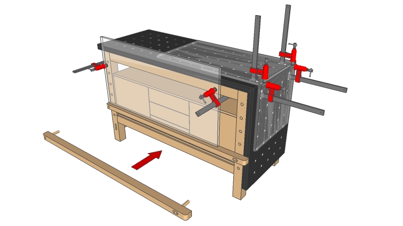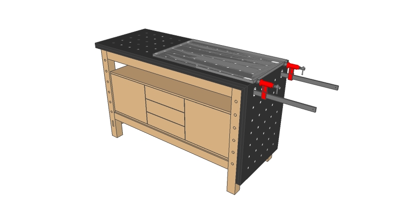 En occurrence ici, une section montrant le détail du côté droit du piétement, m'aurait aidé à comprendre pourquoi il ne semble pas y avoir de (petite, AV/AR) traverse de ce côté là de l'établi : à gauche on voit bien les tenons débouchant, mais rien à droite, ni aucune trace de la traverse elle-même. J'aurais attendu une vue supplémentaire pour tirer cela au clair...
