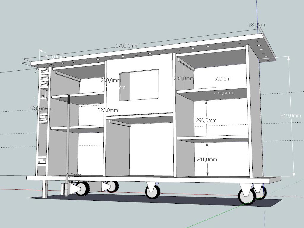apres pas mal d'heures sur sketchup pour adapter l'etabli de Nicolas je vous mets une photo de mon adaptation. Impératif pour moi qu'il soit mobile. Merci a Millie, Mac, Pilpoil et Mseguin pour leurs conseils.