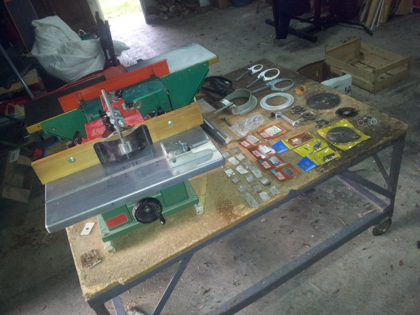 L'ancien propriétaire a gardé le moteur (qui était a double axe, de manière a faire tourner la raboteuse + une toupie kity 627.)