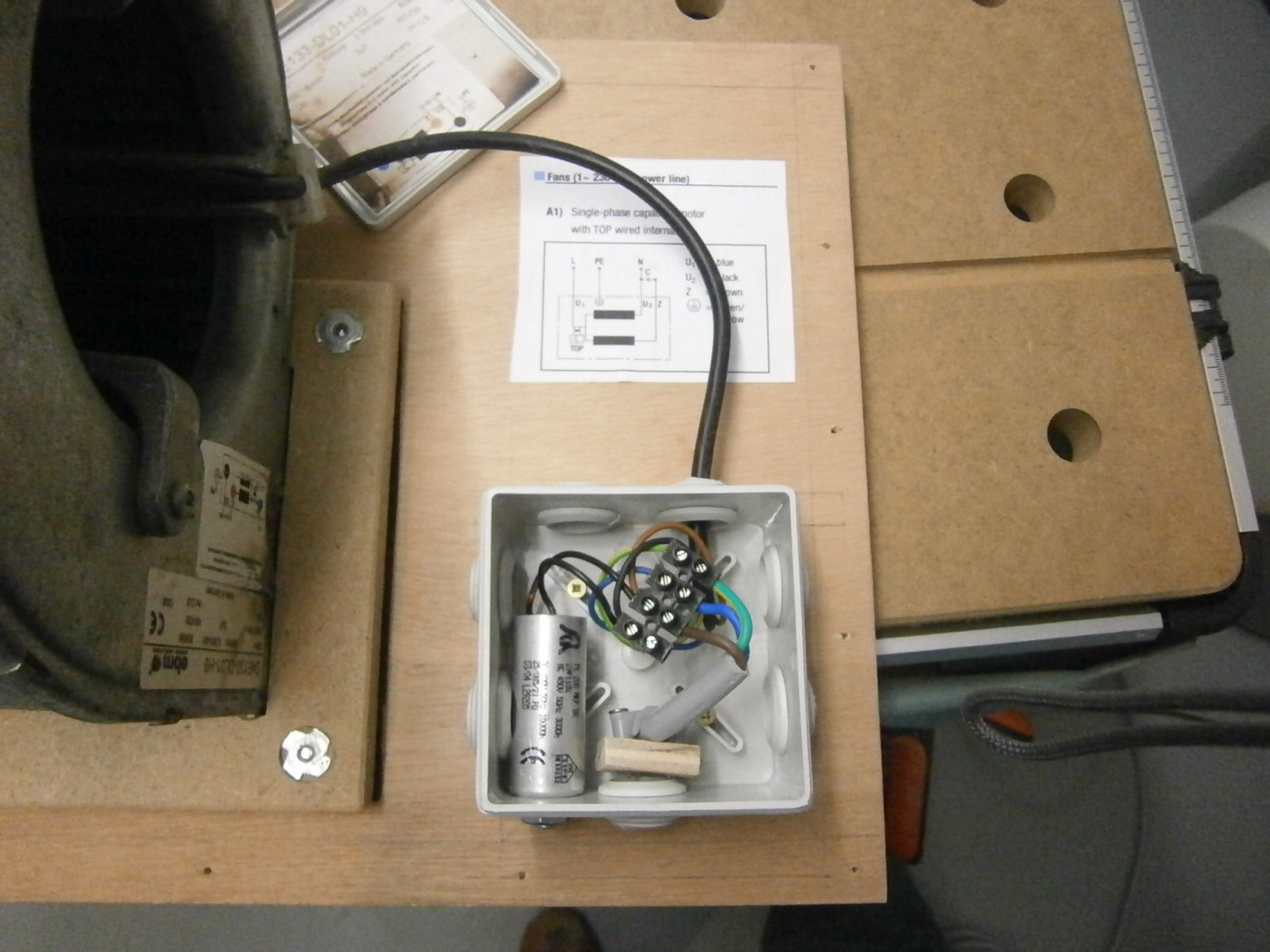 Photo 019 - Raccordement du moteur et son condensateur de démarrage dans une boite de jonction installée sur la paroi du fond