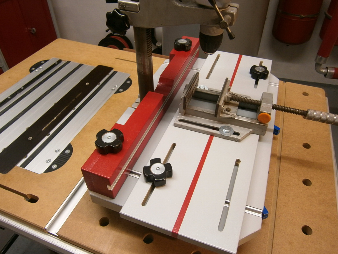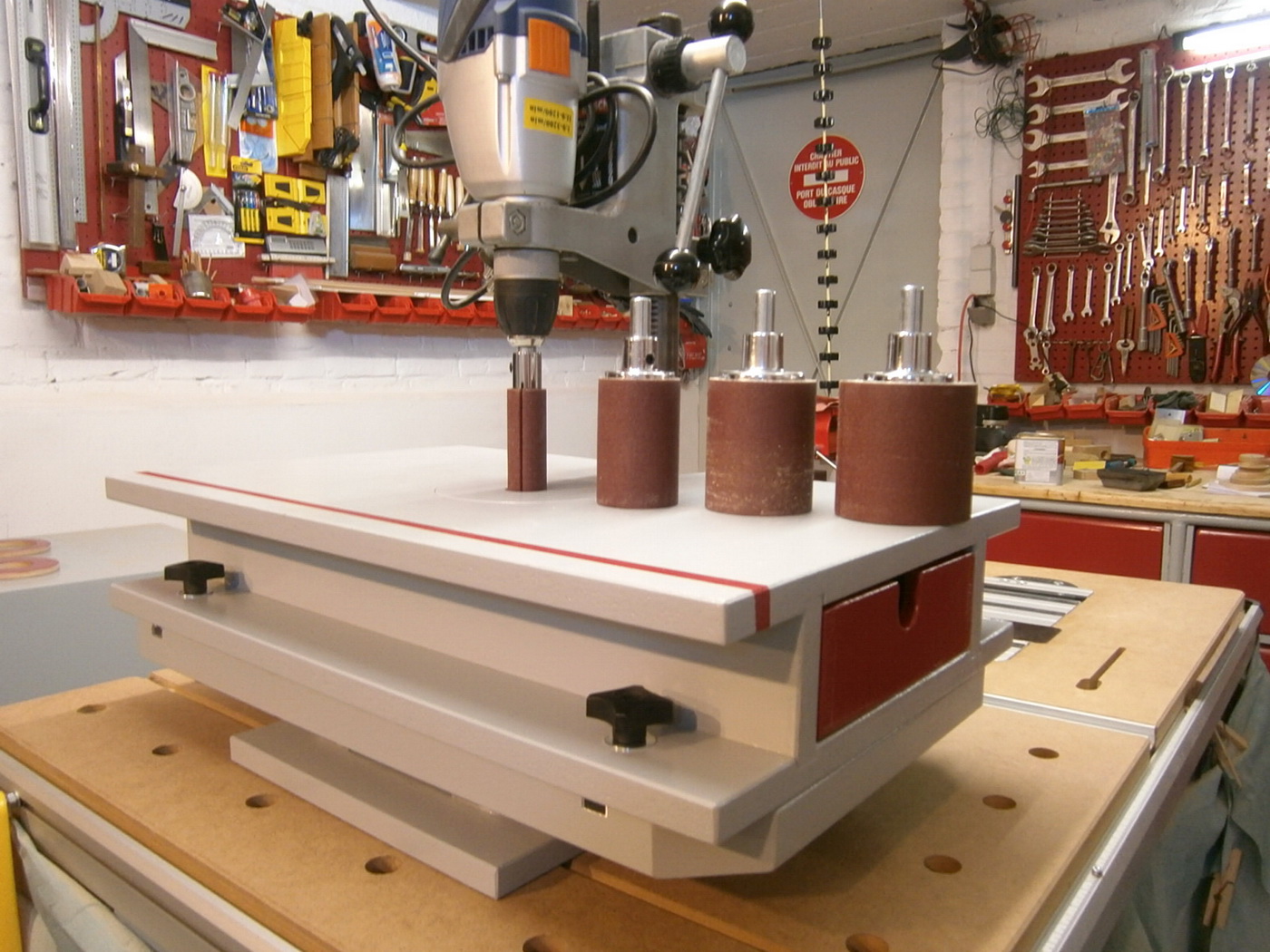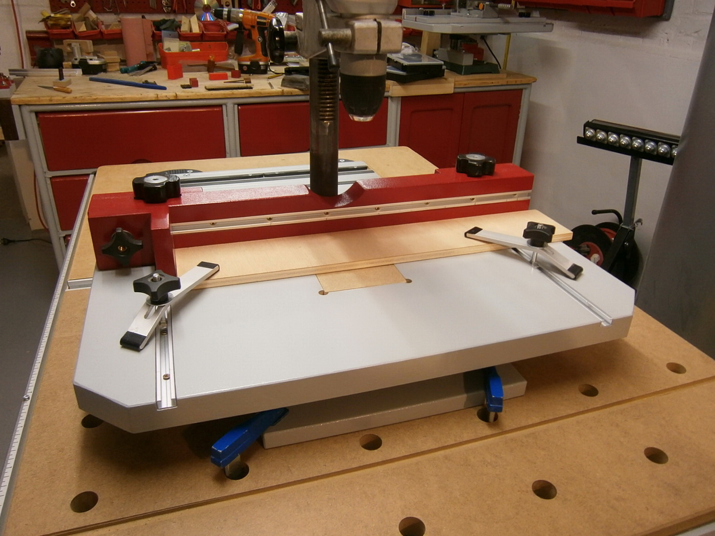 Je possède une autre table similaire installée sur une perceuse à colonne. Tous les accessoires réalisés pour la table présentée se montent sur ma seconde table sans modification et sont donc totalement interchangeables.