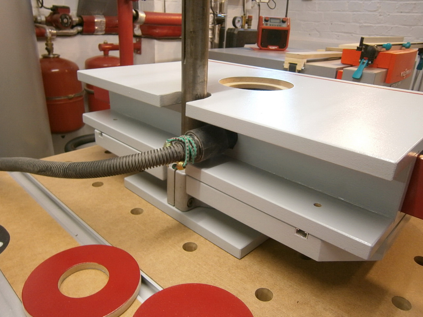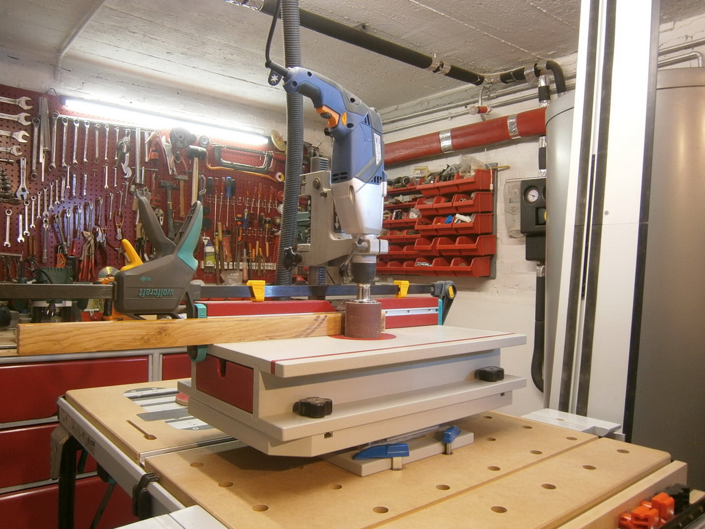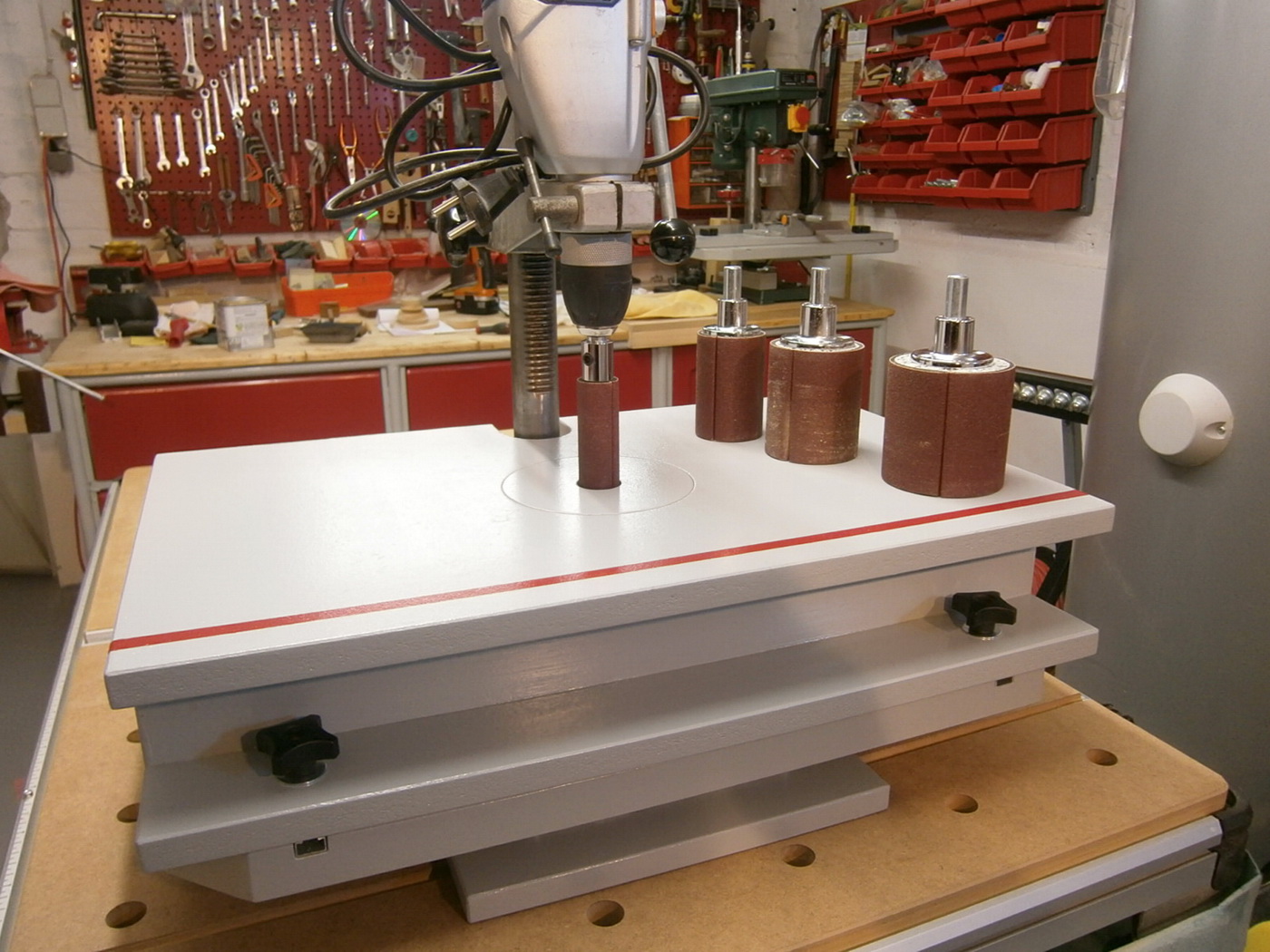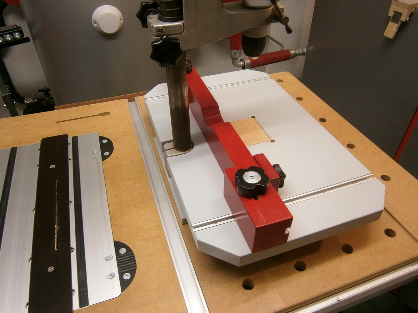 Je possède une autre table similaire installée sur une perceuse à colonne. Tous les accessoires réalisés pour la table présentée se montent sur ma seconde table sans modification et sont donc totalement interchangeables.