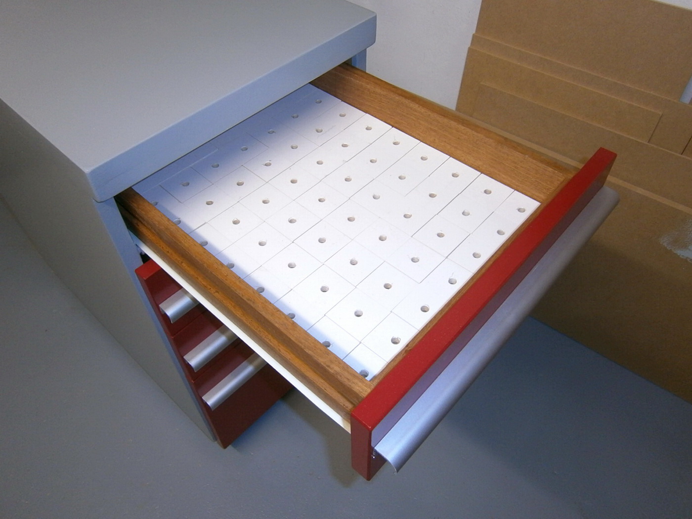 Ouah trop bien fait tout ces tiroirs de rangement .... Par contre pour les fraises étroites j'aurais mis sur des carrés plus petit histoire d'avoir de la place pour de nouvelle venues ...