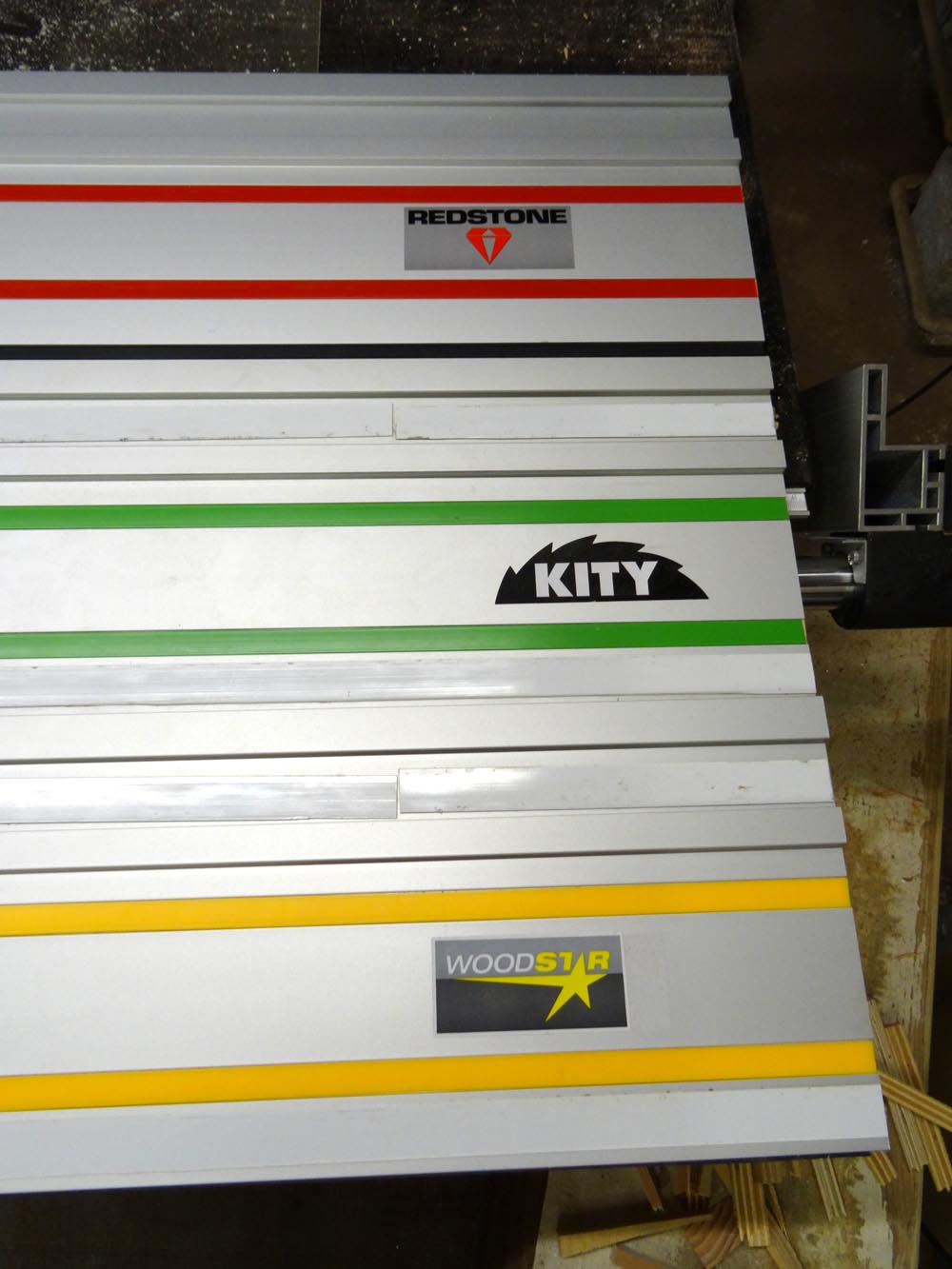 J'ai donc fait l'acquisition d'un nouveau rail de 1.4m chez le magicien des prix (....). Un Redstone ce coup-ci, ce qui change tout par rapport aux rails précédents .... (made by Scheppach, c'est bien marqué dessus). En tout cas, cela me fait désormais un bien joli arc en ciel de rails.