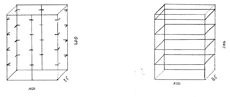 - soit je fais un cadre en bas avec des tasseaux rectangulaire et ensuite du 40x40 pour chaques niveaux ou il y aura une planche. Cela nous donne donc 12 niveaux, ce qui fait pas mal de tasseaux!