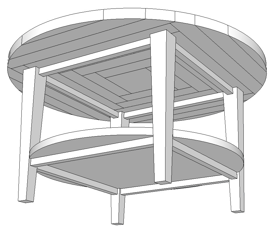 voir dessin pour comprendre mon explication, donc je vais partir sur des pieds de 5cm en haut et 3cm a la base, ensuite faire 2 ceintures de 2cm d'épaisseur pour le plateau du haut et du bas, voir plus petit suivant les différents conseils, enfin le plateau inferieur de diametre plus petit, je pense le faire "englober dans les pieds" c'est a dire que le plateau inferieur je lui coupe les encoches au emplacement des pieds donc les bords dépasseront un peu le périmètre des pieds sans qu'il soit plus grand que le plateau supérieur (je sait pas si c'est bien clair). Avec le dessin se sera je pense plus clair, d'ailleurs jft68 tu peut y faire ses modifs sur la modélisation pour mieux visualiser ?
