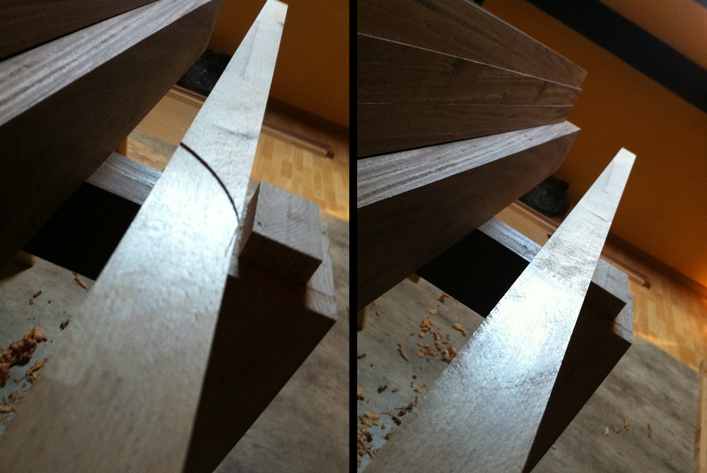 Évidemment il y avait un léger décalage dans le trait de scie (3/4 de mm ~) , du coup j'ai repris tous les chants au rabot, plein de copeaux.
