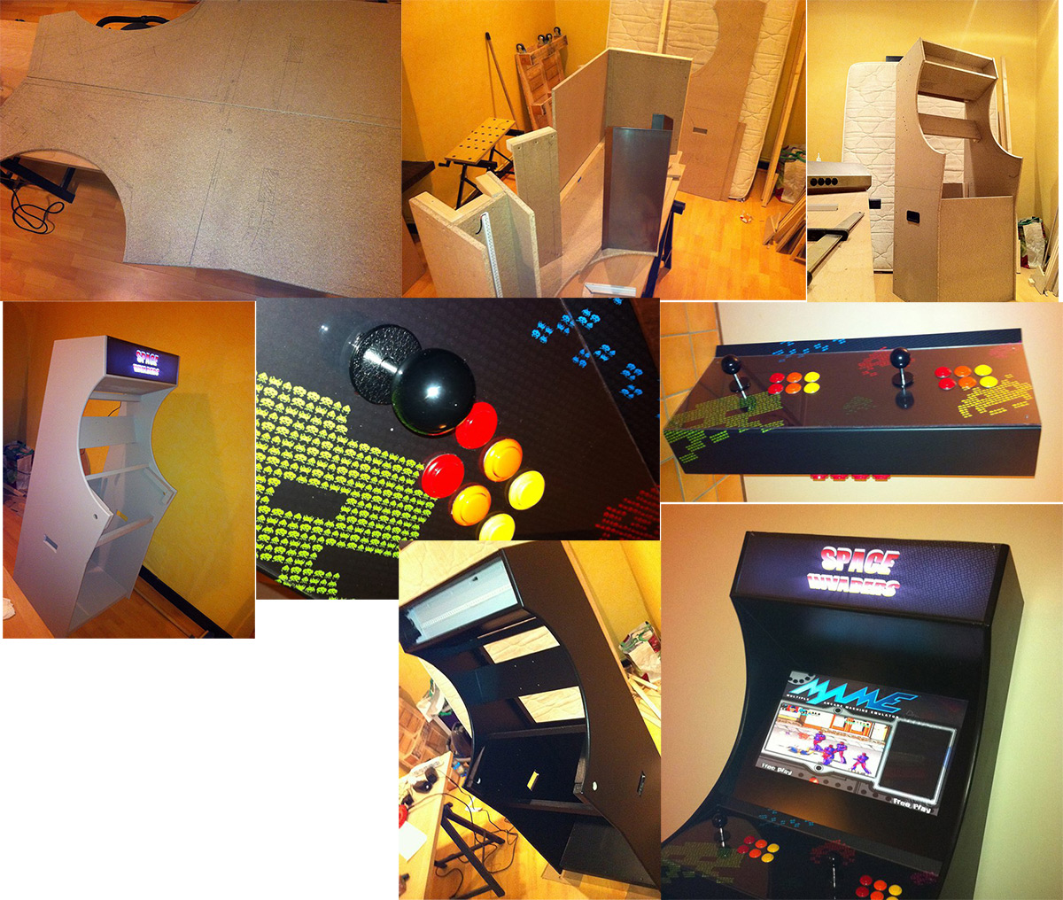 J'ai construit une borne d'arcade en mélaminé et tasseaux il y a quelques années, c'était ma première tentative... mais je rangerais plutôt ça dans le "boulot d'agencement qui a failli me vacciner définitivement de fabriquer des choses par plaisir". Quand j'y repense, c'était le matériau que je hais (mélaminé) avec l'outil que je hais tant que j'en ai pas une qui aspire la poussière (défonceuse) :lol: J'étais content quand elle était fini, mais je me suis dit "jamais plus avant de pouvoir faire du massif".